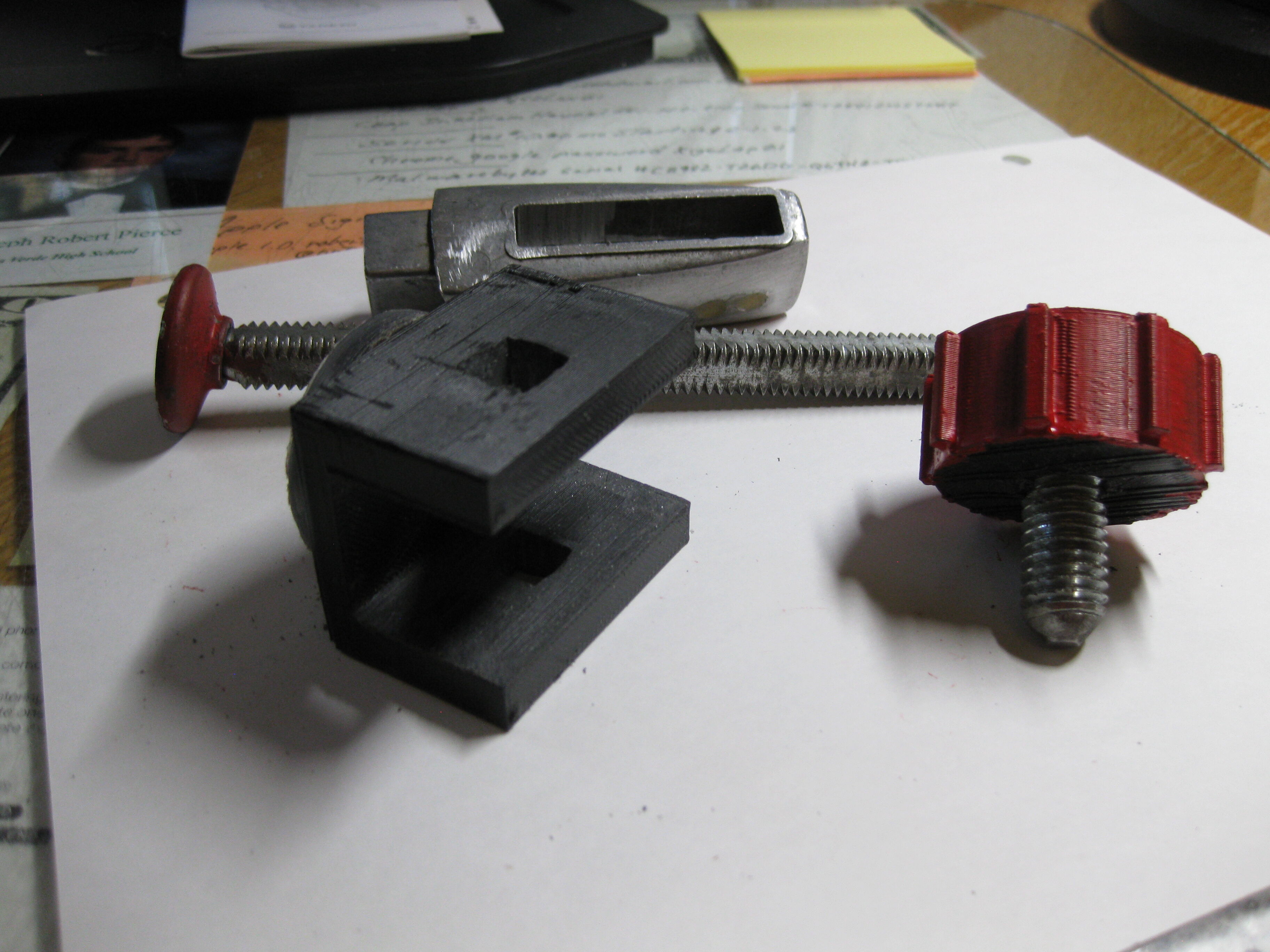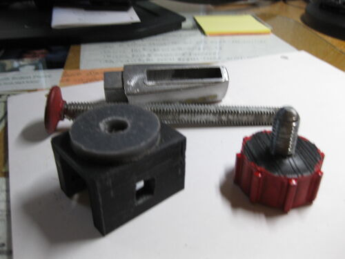 This mod replaces the two nuts on the miter gauge that are used to adjust the position of the hold down square bolt. It adds a knob that replaces the two nuts.