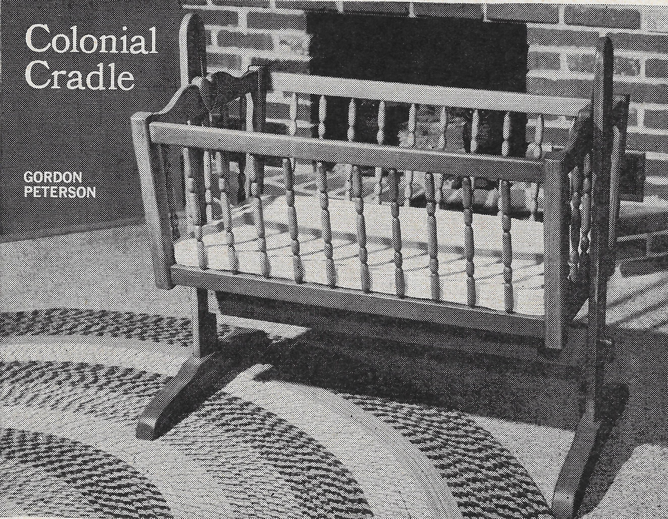 This charming Colonial Cradle has a touch of the modern with its ball bearing "suspension." The bed part of the cradle hangs from the end posts on metal rods, the rods being fitted in ball bearings that are set in counter bored holes.