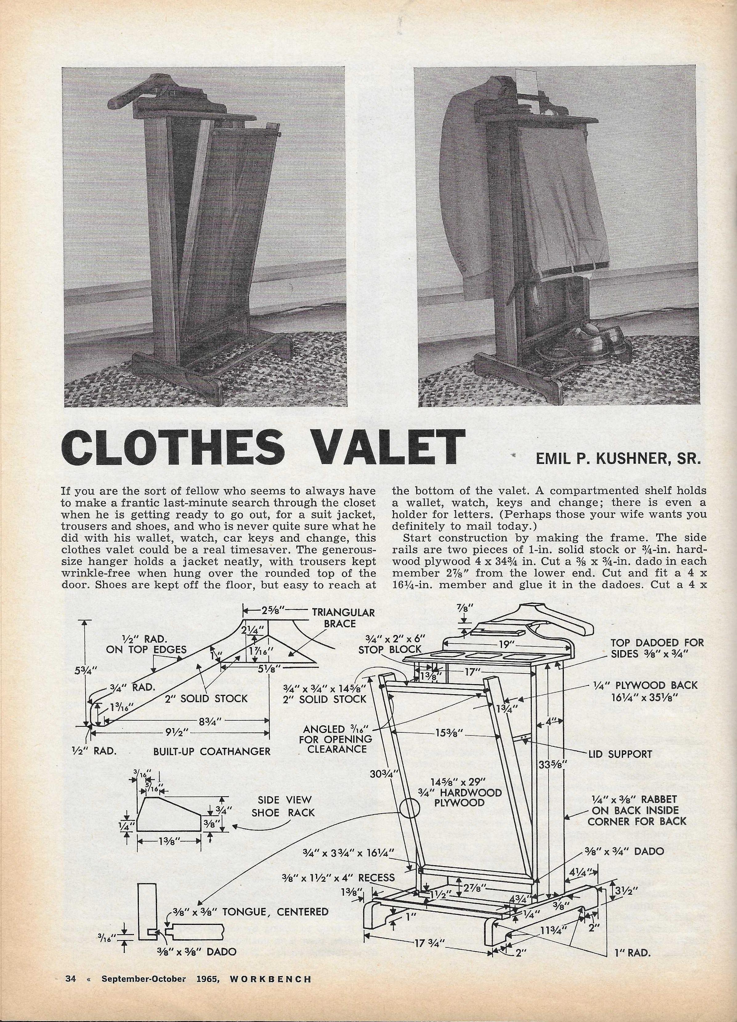 QuoteIf you are the sort of fellow who seems to always have to make a frantic last-minute search through the closet when he is getting ready to go out, for a suit jacket, trousers and shoes, and who is never quite sure what he did with his wallet, watch, car keys and change, this clothes valet could be a real time-saver.