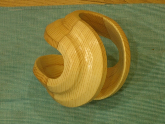This is the brother of the Orb I posted not long ago... it is made of 4 half-bowls, assembled "inside-out" compared to the Orb. It, too, is fashioned after the work of Malcom Tibbetts, however, I used only the scroll saw to cut the wood, assemble the bowl parts and sand/shape into what you see. This project was made of 1/2" poplar.