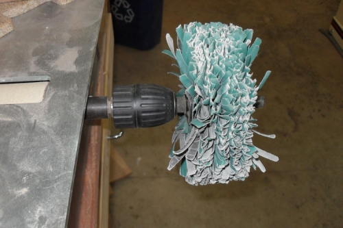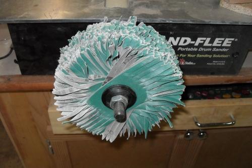 I didn't have time earlier to post a picture of the sanding mop but here goes.  Picture of mop from two different angles.  Sanding mop doesn't hurt your hands but requires a firm hold on the item if you don't want it tossed across the shop.   Grin.gif