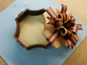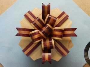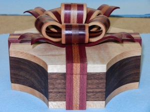 The body is cut from a solid block of Walnut, the bottom & lid is Maple. The flat & wavy ribbons are laminated from Purple heart & Cherry then cut out on the scroll saw. The ribbon bows are laminated Cherry, Purple heart & maple then cut on the scroll saw. Finished with Danish Oil.