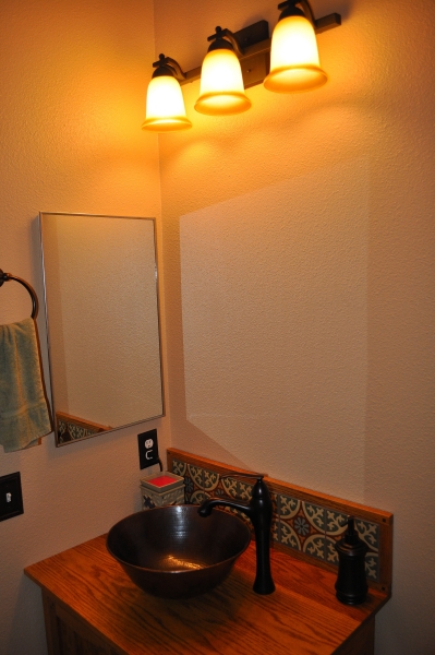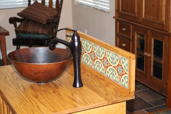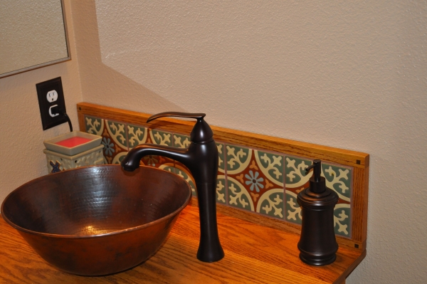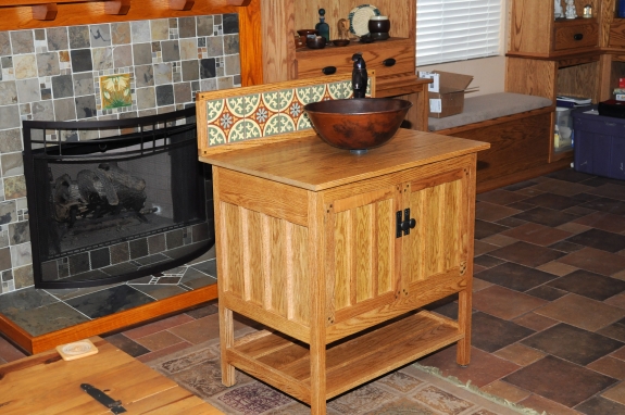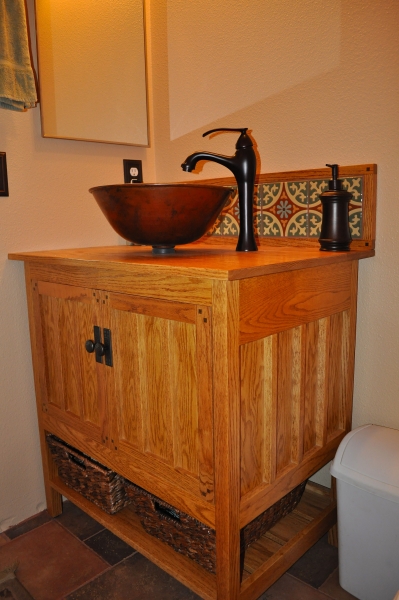 The design was modified from a similar vanity that I found online that my wife and I liked. My vanity was made from red oak that was stained and finished with General Finishes Endurovar. The back splash tile are hand painted Mexican tiles in muted colors that fit into the Califronia Arts & Crafts/Craftsman/Bungalow/ Hacienda style. The vessel sink is hammered copper and the faucet is oiled bronze and the knobs are antique brass. The accents pieces are all oiled bronze including the towel bar, toilet paper dispenser, toilet tank handle, soap dispenser, and switch/outlet covers, The important thing is that my wife is happy with it and, therefore, so am I.