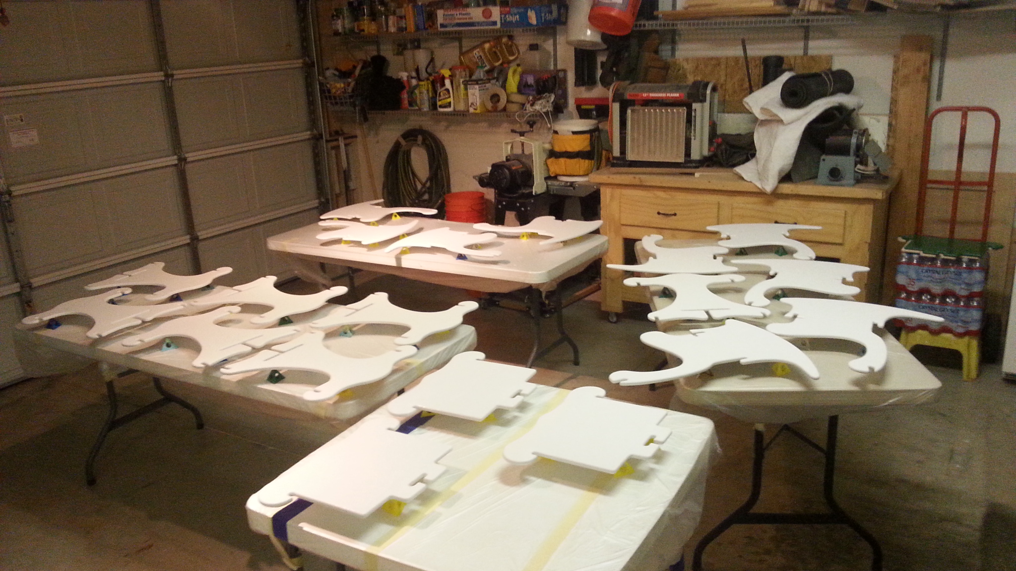 Templates traced out on 2  5'x5' sheets of 1/2" Baltic Birch plywood. Each sheet will yield 2 full chairs plus an extra back and seat piece as well as some extra front stretchers and locking keys. I had 2 side pieces left over from my last run so I was able to make 5 chairs instead of 4 which was good.