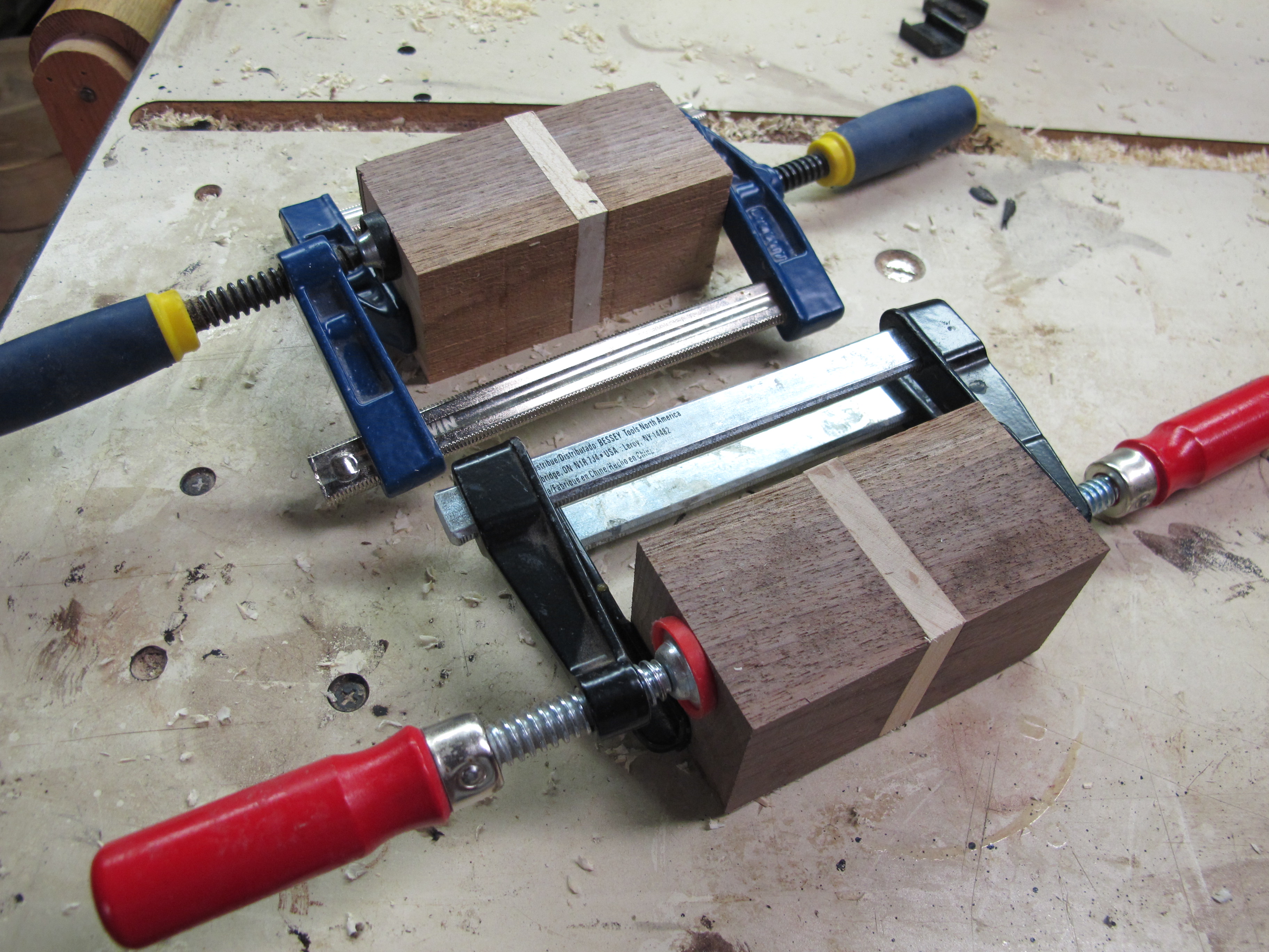 To fancy the scoops up a little, I glued up blanks of maple and walnut-