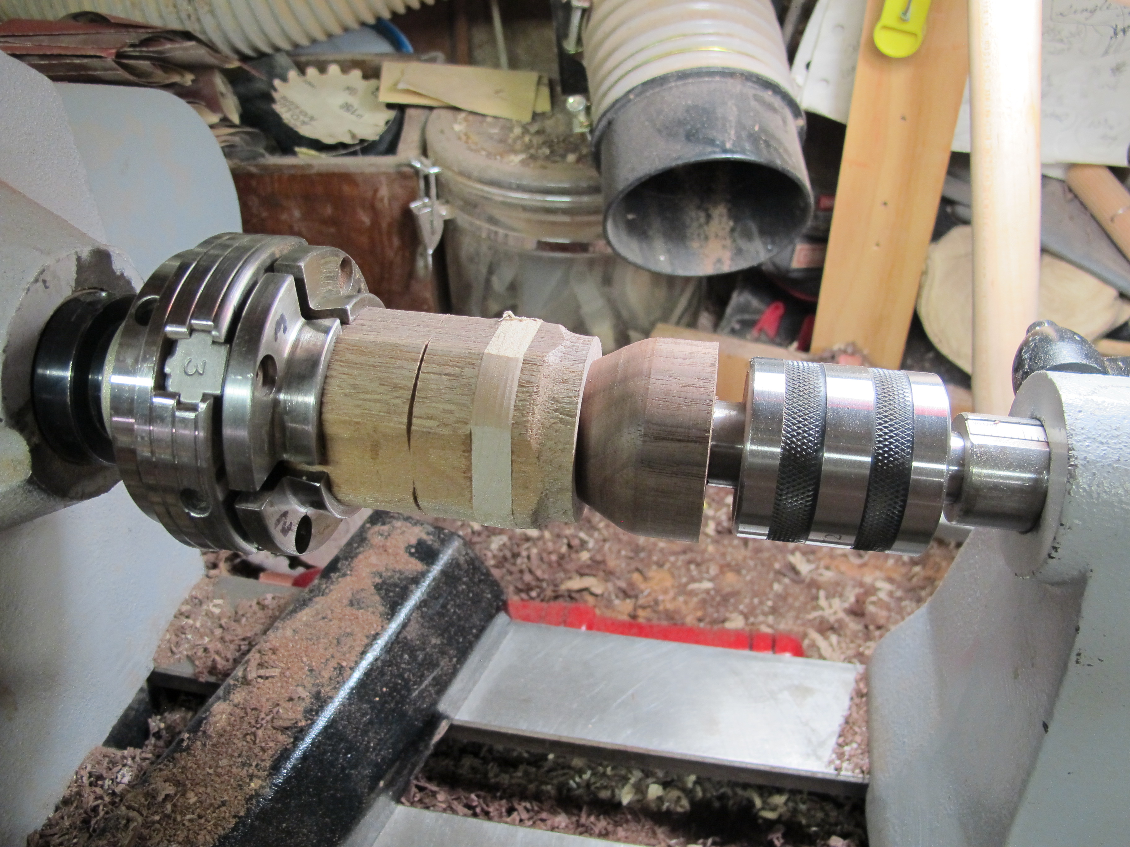 What I needed was a support and a centering device. LIGHT BULB! A cone shaped addition to the tail stock. I turned a cylinder, bored a slightly undersized hole (the closest bit I had), Enlarged the hole to fit over the point of the tail stock live center. Then shaped a tapered cone.