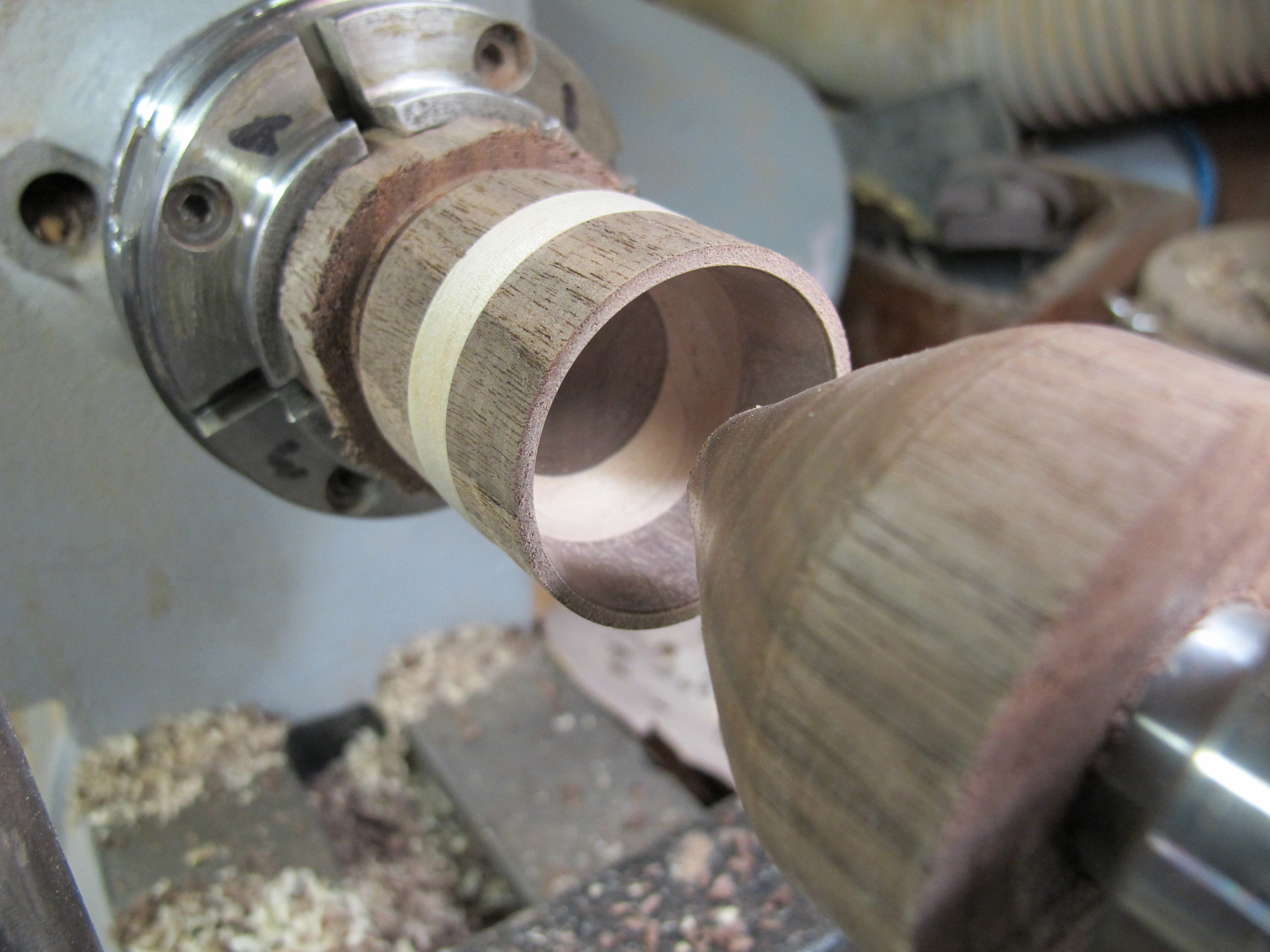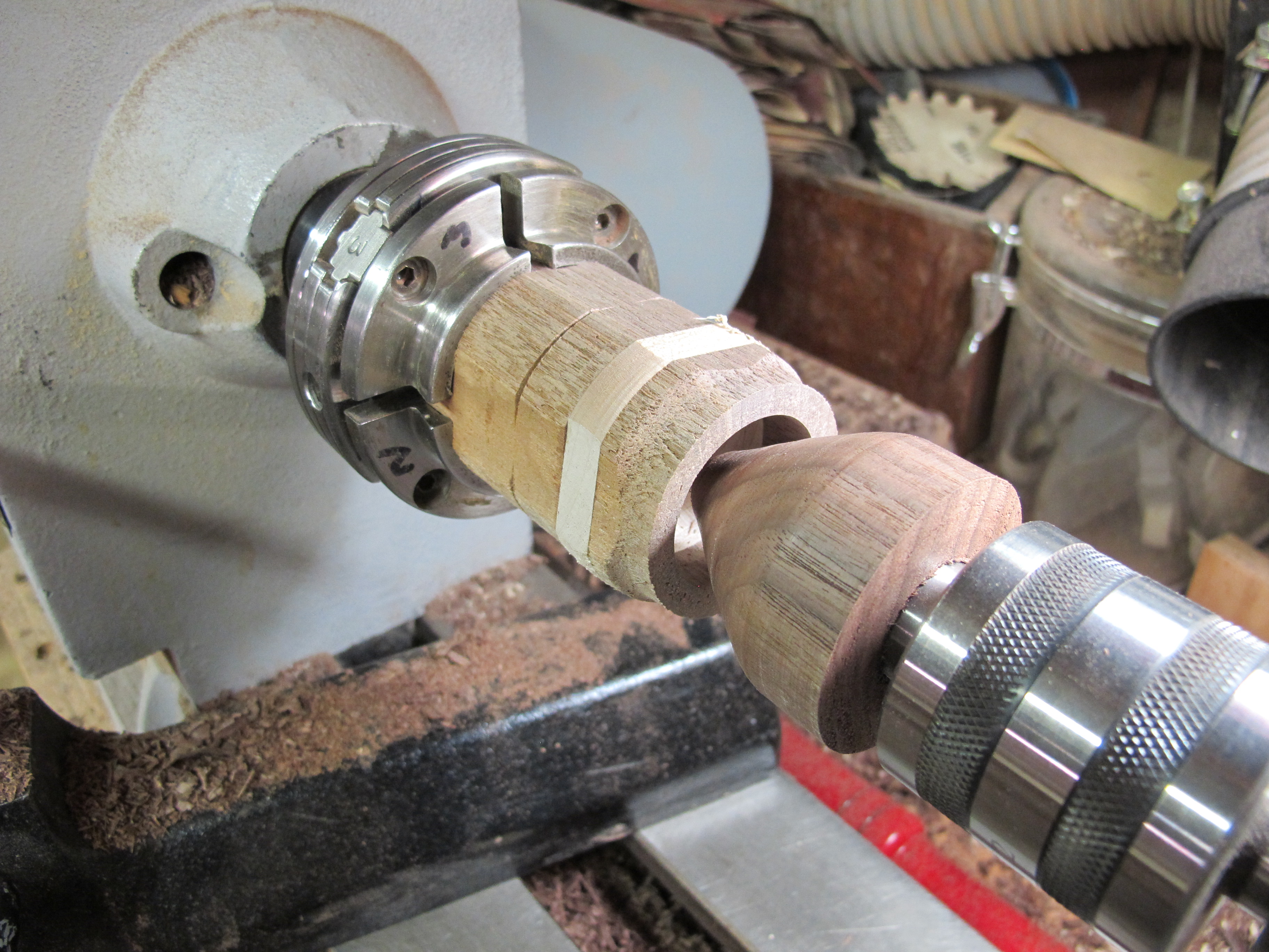 I needed to shape the inside first to be sure I had the correct "volume"- then I could move on to shaping the outside. Even though the blanks didn't extend too far from the chuck, I thought it would be better to support the "free" end. In addition, I always have difficulty re-centering a turning in the chuck when doing the operations in steps. I made an index mark on the chuck and then put a witness mark on the turning, but it still doesn't spin true.