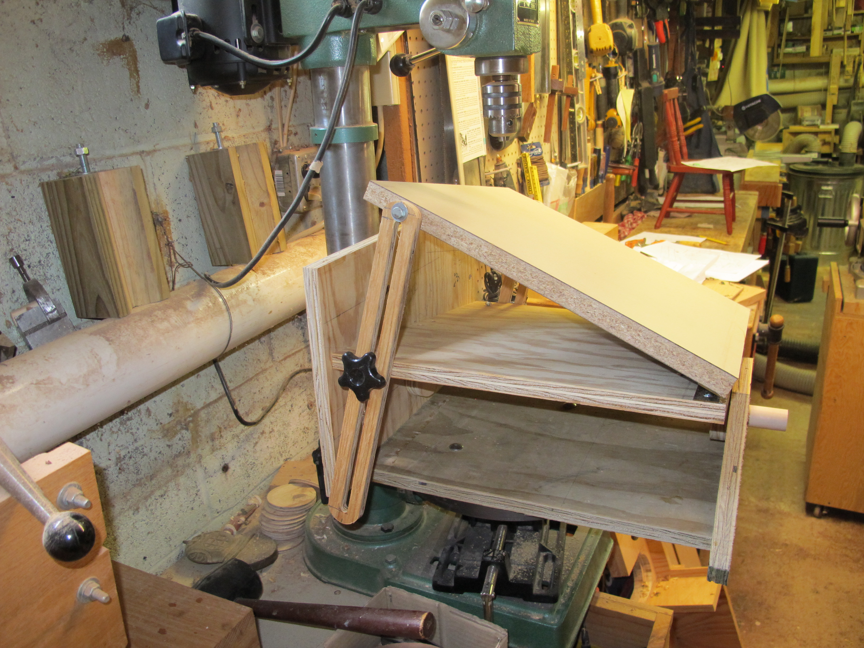 That's a cool drilling jig, John. Several years ago, I made some chairs for the little girls next door. Practically every hole had a compound angle. I made this jig for drilling the seat and legs.