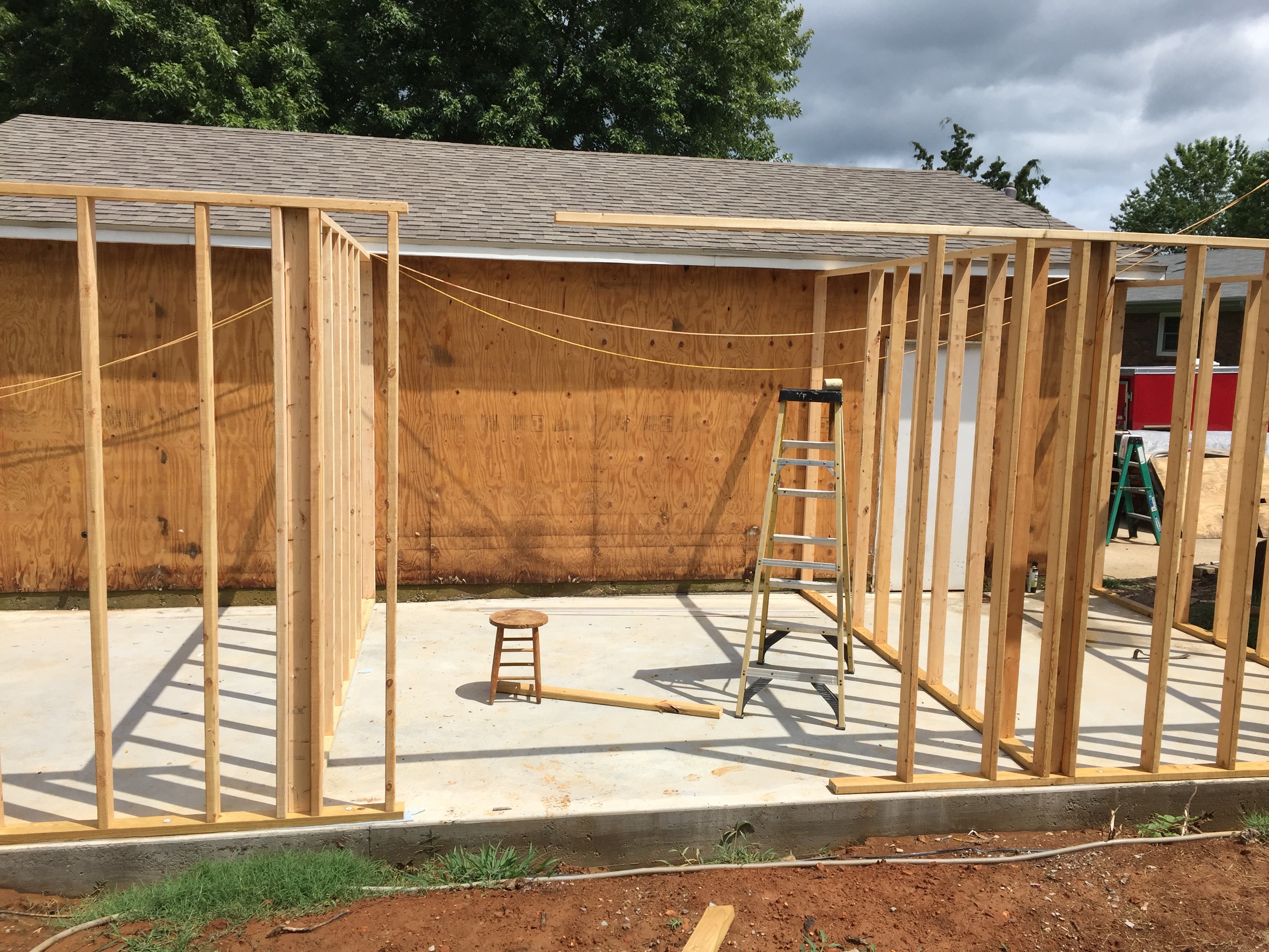 Today I got the last of the interior walls framed and in place. I have left off the last two studs closest to the building so I would have a walkway while working on it. Keeps me from having to go all the way around each time I need something.