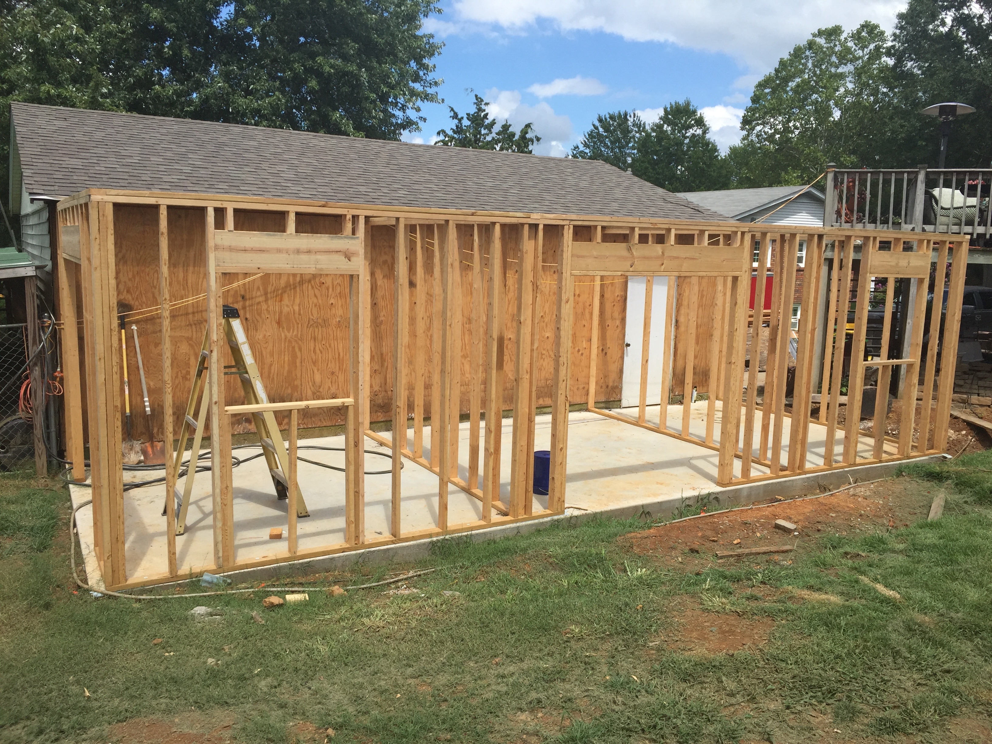 Between the rain I have been working as much as possible on the shop expansion so I can get it in the dry as soon as possible. Beth helped me on Saturday and we got the top caps one all the walls and finished the headers and framed out the two windows.