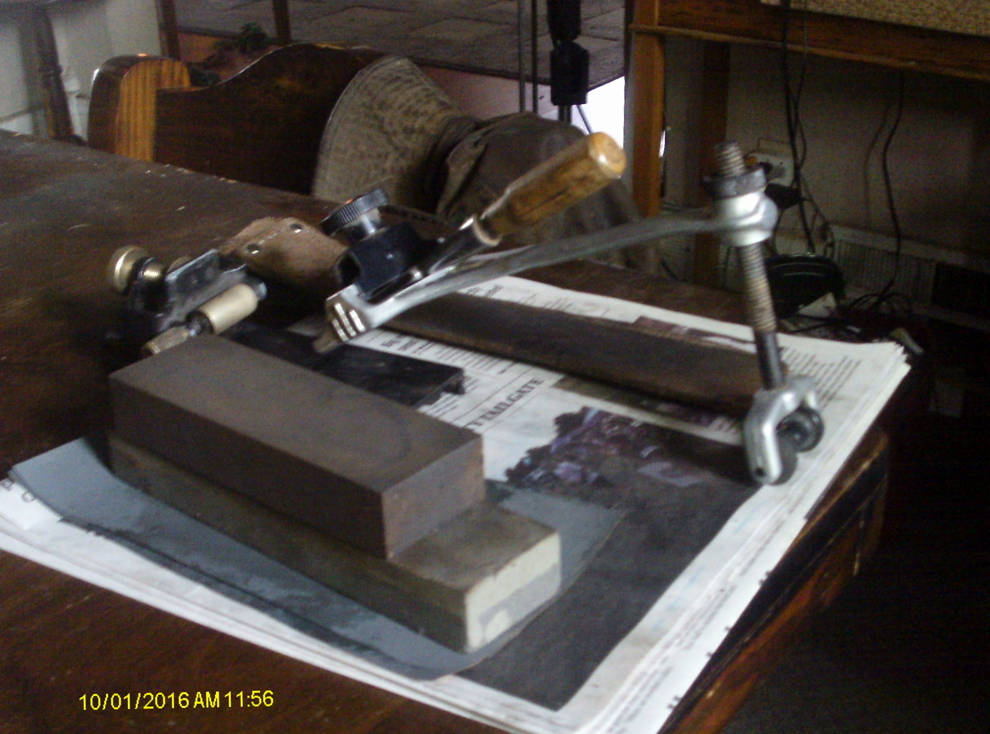 600 grit stone, 1K grit, and 2K grit sandpaper, a leather belt for a strop, and a Veritas MK1 honing jig.    Found out, right off the bat, the Mortise chisel does not work with the guide.  Way too many angles going on.    Lot of free hand work with that one.   There is an area between the front wheel and the platten on the beltsander, that does work nicely for the bevel I needed...