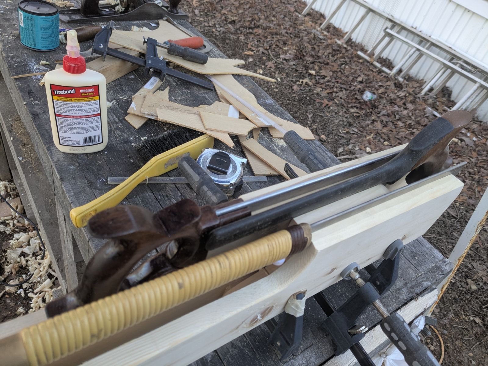 Seeing your outdoor "shop", I'd like to make you aware of something I learned many years when I had a basement shop with no heat.  It's called "chalk temperature."   It's the temperature at which PVA glues, like the Titebond in your photo, turns white after glue  up and does not have full strength.  For most PVA glues it's about 45 to 60 degrees F, depending on the variety.  Not  only does the glue need to be warm, but if you are gluing  up  wood that's 40 degrees, it will cool a thin glue line and cause the problem, too.  Best to do the glue-up when the ambient temperature is above the chalk temp.