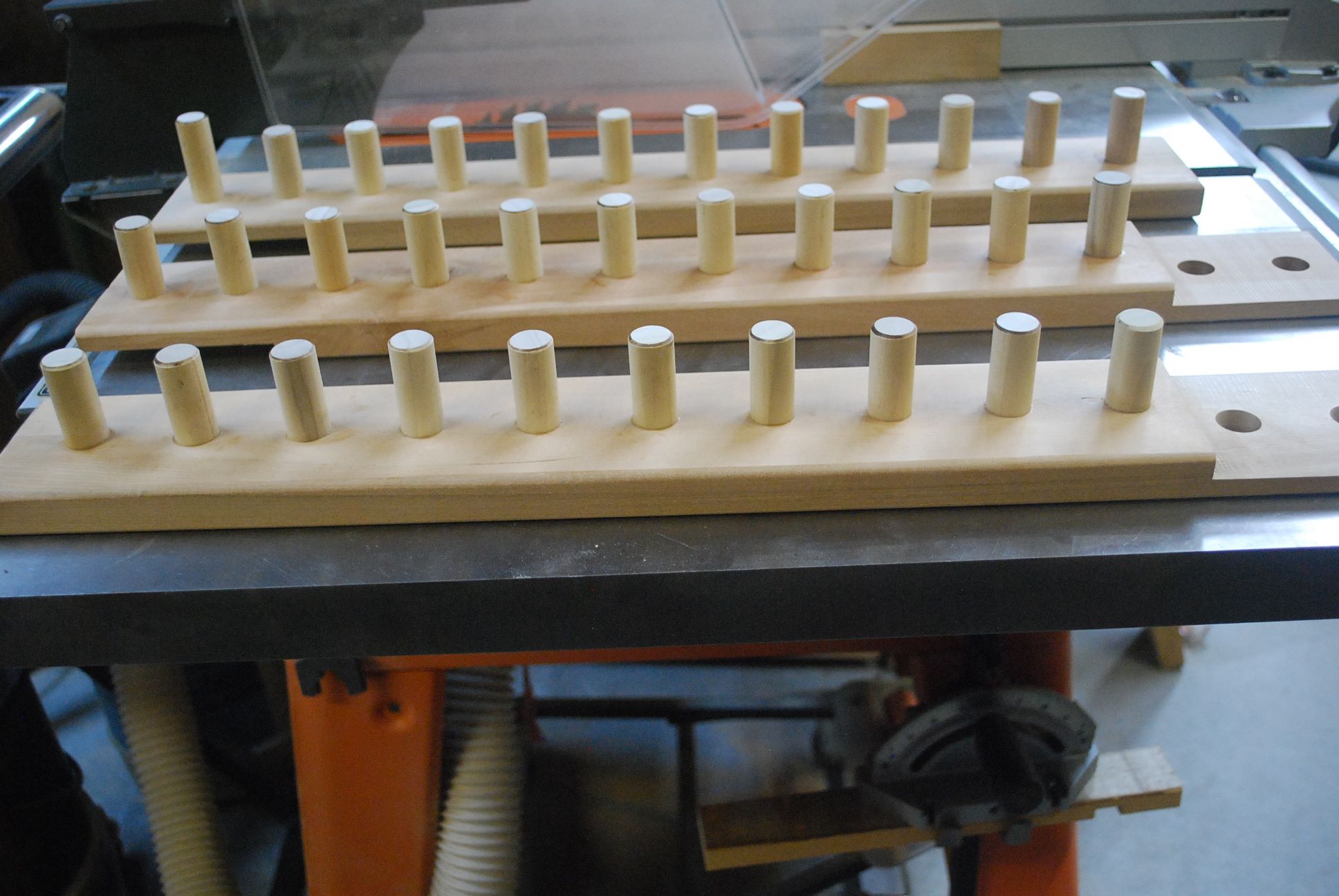 Had a problem finding 3/4" dowels that were actually 3/4"! :WonderScratch: Tried four places, and they were all undersized, with the ones at the big orange store even being oval instead of round! Her husband finally found two lengths of dowels in his garage, really old stock, that fit perfectly! Got 31 pieces out of those, but needed 33, so I turned down a short piece of 1" broomstick, and called it a day. I'll take the outfit over tomorrow, and see if she wants a clear finish on it.