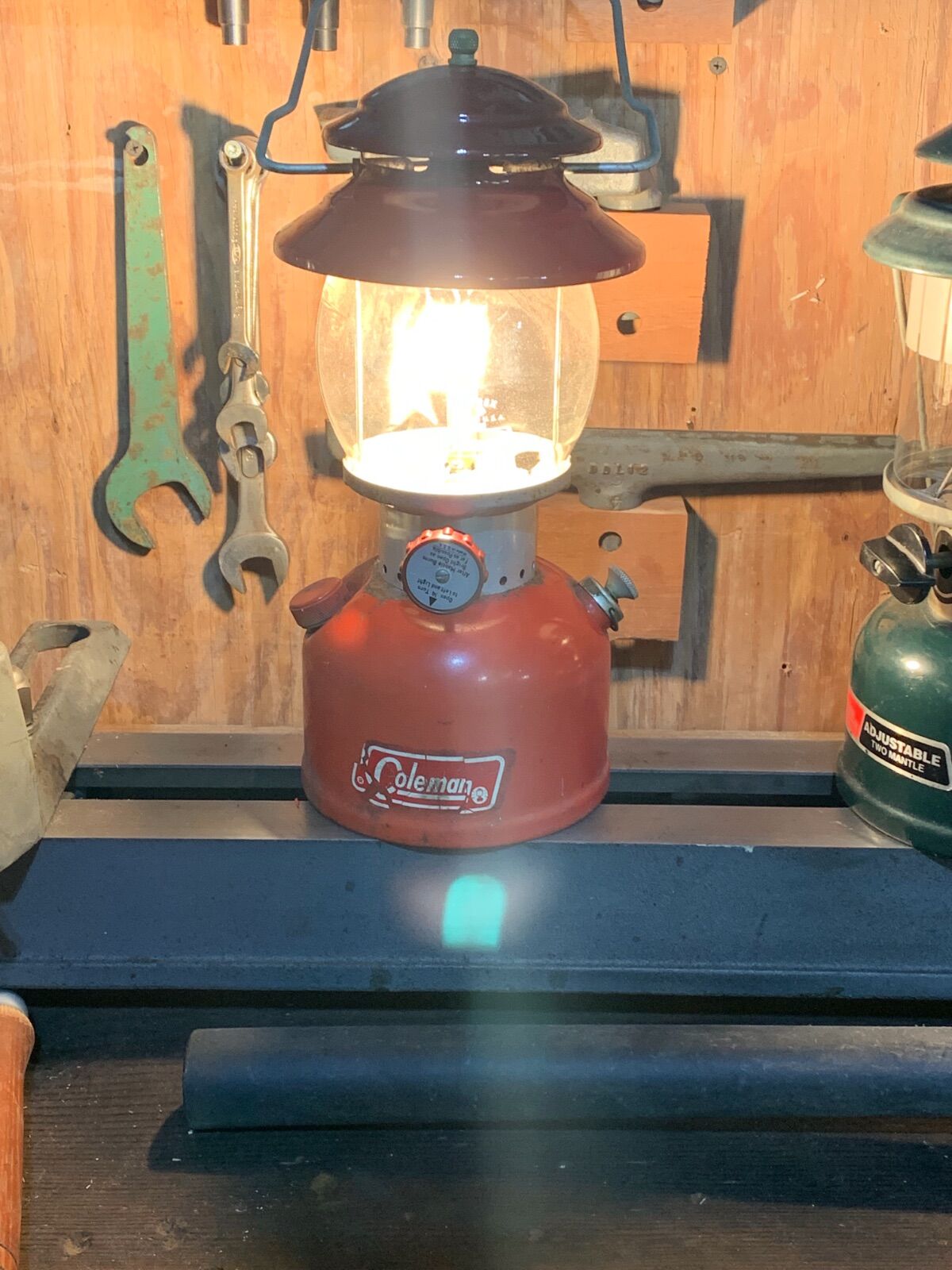 As of last evening, a lot!  I am trying to do some clean and organize so it always gets worse before it gets better.  But hey!  I have a floor again!  Check these before and after shots!  I will take this for a  win!  Probably continue on this today!  I included a shot of my other vice, a few of the Coleman’s I have been working on…Have a good day!