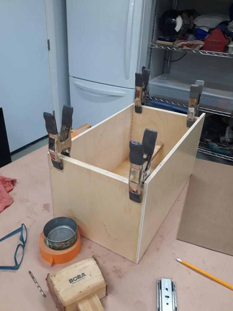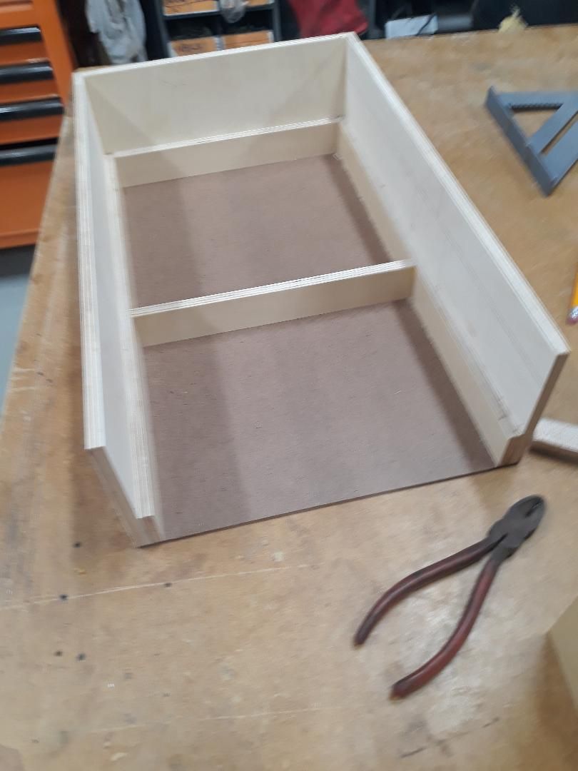 and one will notice that the drawer that is cut looks funny and it should as the ''brain surgeon'' that i am, managed to make drawer 2 inches too long, how that happened is the '' great wood working mystery of the week'', so wacked that sucker to actual required length, speaking of out worldly tongue lanquage and off we went to assemble the ''fix'' . i did complete both drawers and got the drilling done for the half inch router bits, this will be on one side and qtr inch on other size, with a junk drawer, you know the one you throw crap in , and forget about it till the end of time.