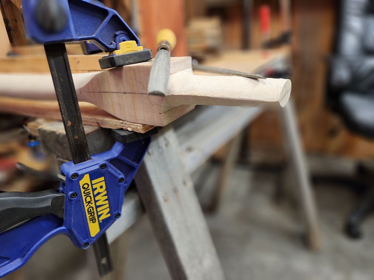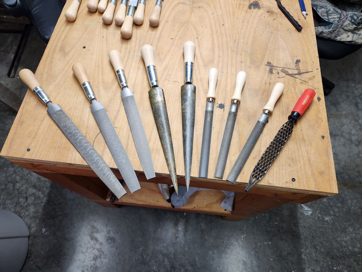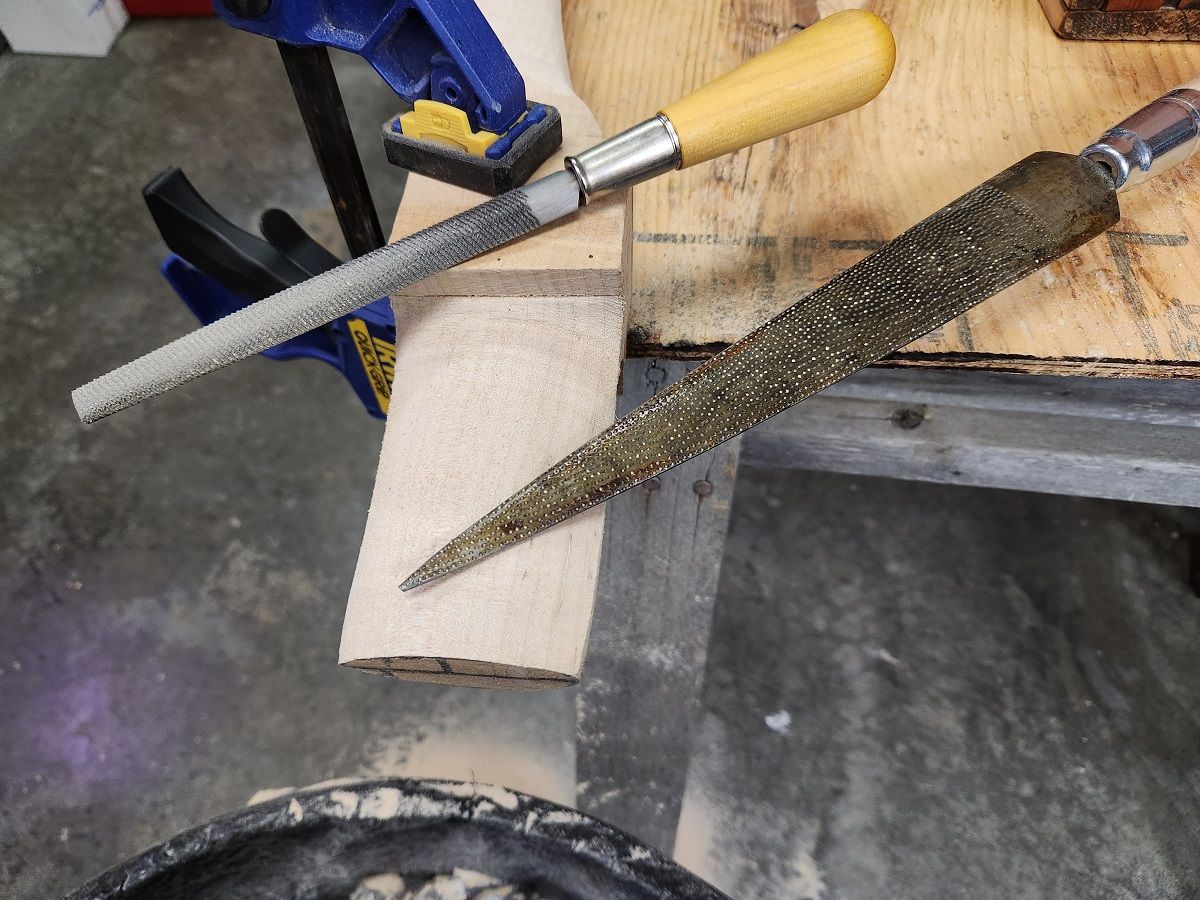 So I was wanting to do something from a blank using only hand tools...and this ended up being it. I picked up a variety of rasps for the roughing out to see what worked best for me. From left to right is the one previously pictured..a large Corradi coarse cabinet rasp. Then we have 2 10 " Gold Precision cabinet rasp also Corradi. Next are 2 Dragon rasps from Stewmac in coarse and fine. Next 3 are Iwasaki 8" in coarse, medium and fine...and last is the Shinto. All of these have a strong following and are quality tools. For me the largest ended up being my pick for removing large amounts of stock in short order. The others are coming in handy as I work my way down. Yes they can be pricey but it is the experience I want to have and the things I like to use. I could have easily rounded all this out with a diegrinder and some sort of sanding discs but it's just not what I want to do.