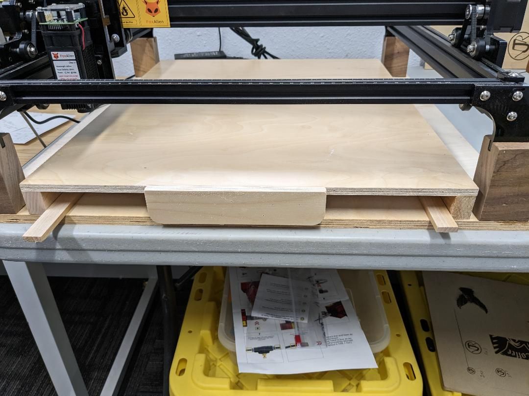 i'll glue down the thin runners to guide the platform in to same position each time, front has a stop block, i'll need to put some positive stops on top of platform to slide engraving pc into to square up with laser head, the stop blocks there will allow me add a layer of 1/4 in ply ontop of plat form which negated me having to make two platforms to accommodate different thicknesses, the laser head travel is about 2-3/4'', so can pull platform and set items on another pc of 1/4'' over the guides to make a flat surface,