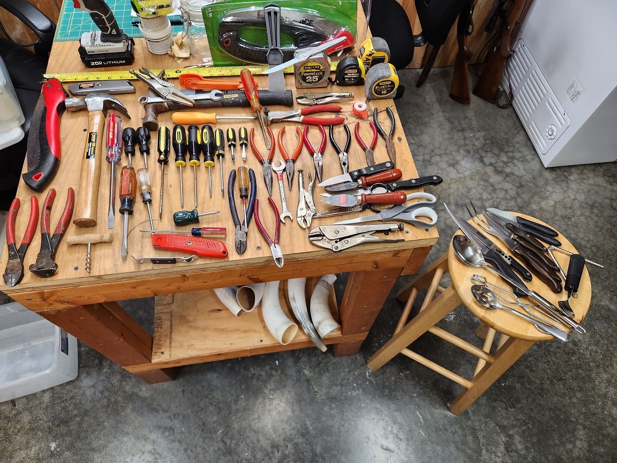 So my MIL went to a retirement community a few months ago. We are cleaning out some of her stuff. Her husband passed away first but she still had what was left of his tools.....very very little but hey there is some old hand tools in the pile. I'll gladly find a place for them in my shop. Everything from the stretched out tape and limb trimmer in plastic forward was the total haul. The guy had a stucco business in Florida for years and had done well....I never got to meet him but he was supposedly a top notch fella. A few of the pieces still have his name and initials on them.