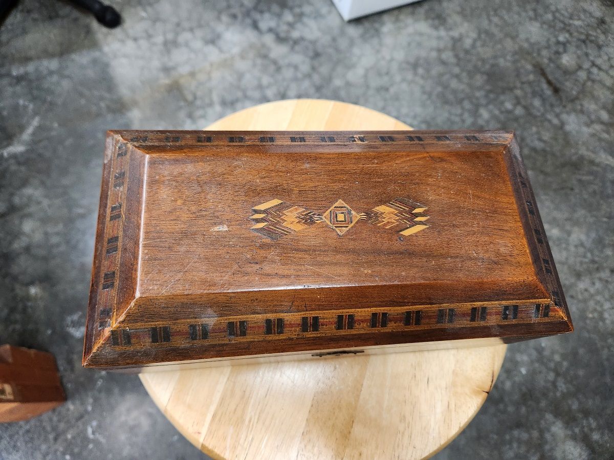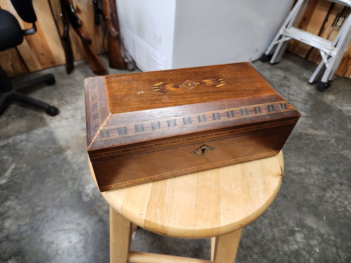Also this little box got my attention. I'll clean it up and give it to my girl or if she doesn't want it I thought some scrimshaw tools or something would look good in it. It's got some age to it...but I like the inlay and overall design of it.