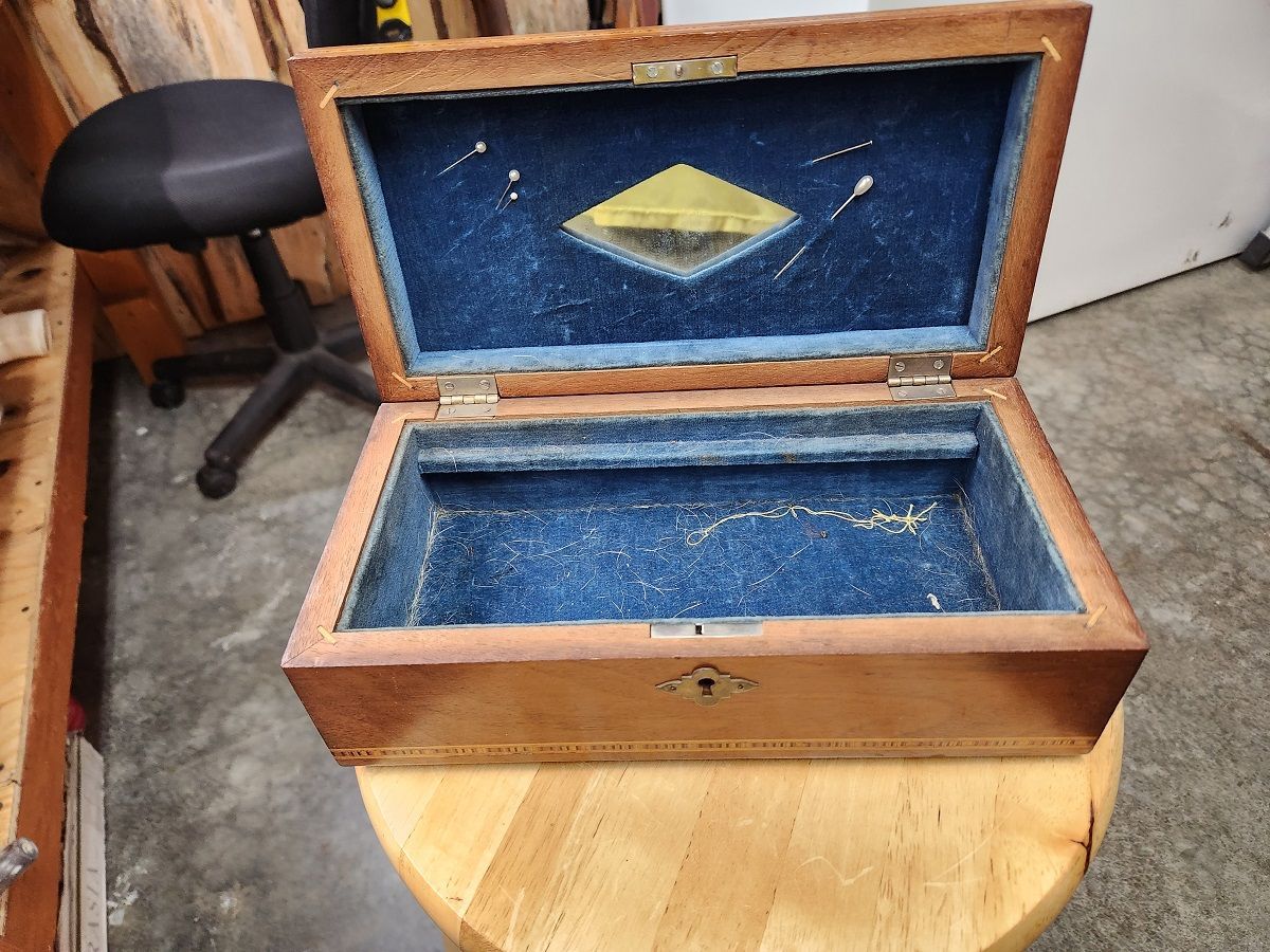 Great story, rescue and save @aaronc. The box is awesome especially with the inlay. Should clean up nicely with a few spritz of hydrogen-peroxide, wiped clean then a light coat of wax. The tools tell a story. Happy you were able to get these.