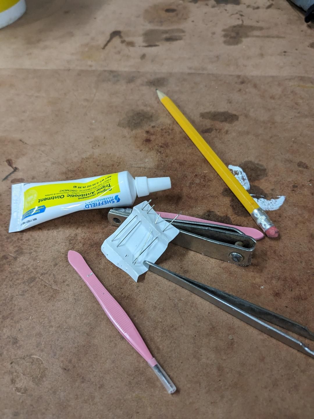 it sat on shop patio for a bit, till the motivation kicked in, and now i have a couple cabinets, i'll have to get some pics of the 3d cabt. and post, but here are the doings on the laser cabts,  a friend who comes over to play weekly gave me the idea to put'm on drawer slides so we can you know mess with;'m when they don't function propertly (frankly if i get near them they go up in smoke , literally, i managed to fry the control board on one, still wondering where i went wrong) anyhows, as one pic will show a necessary med kit for the soft hands that seem to attract mother natures needles, whether they be from a mesquite , or ironwood tree, a cactus or just regular ole treated lumber.