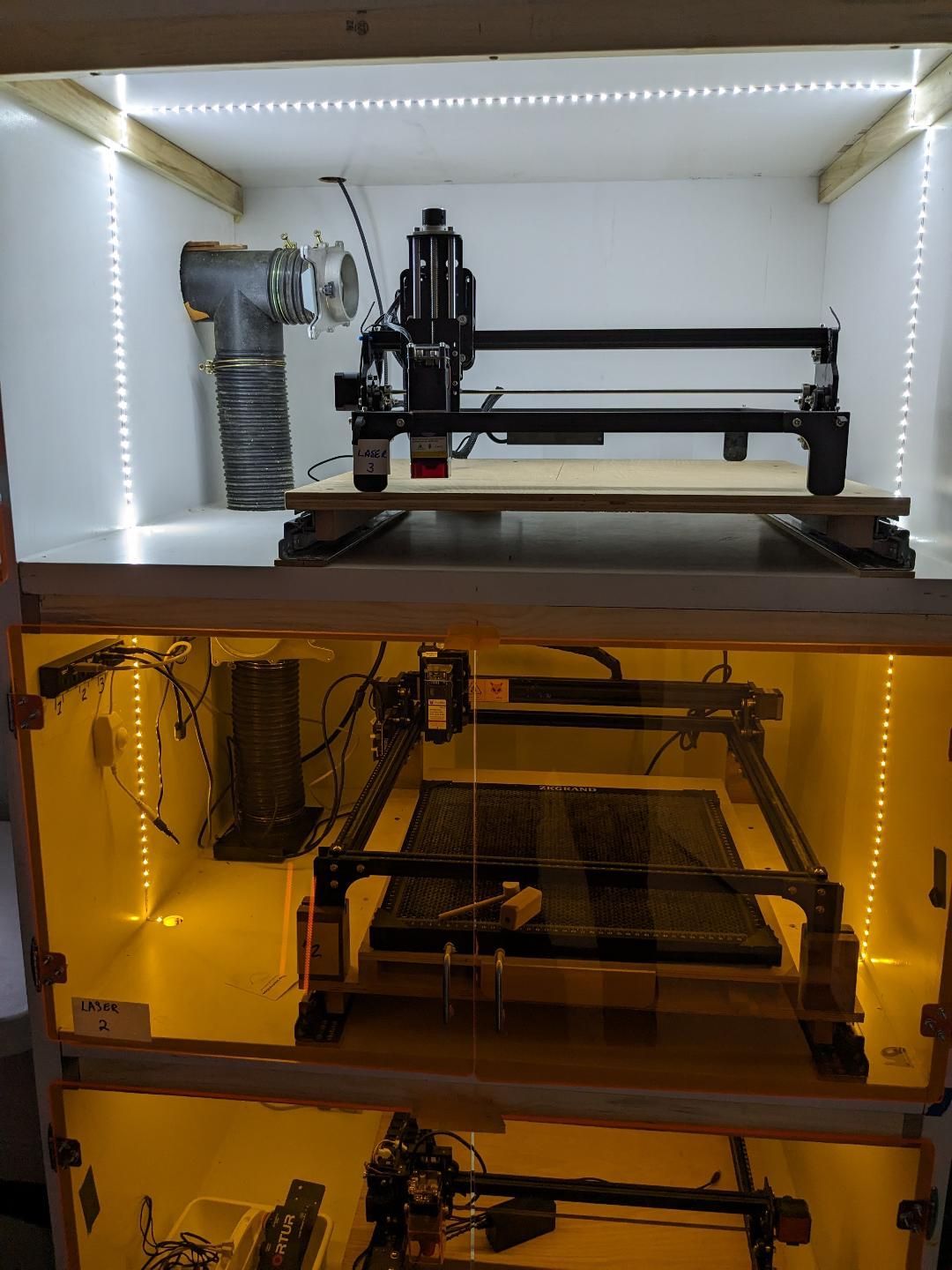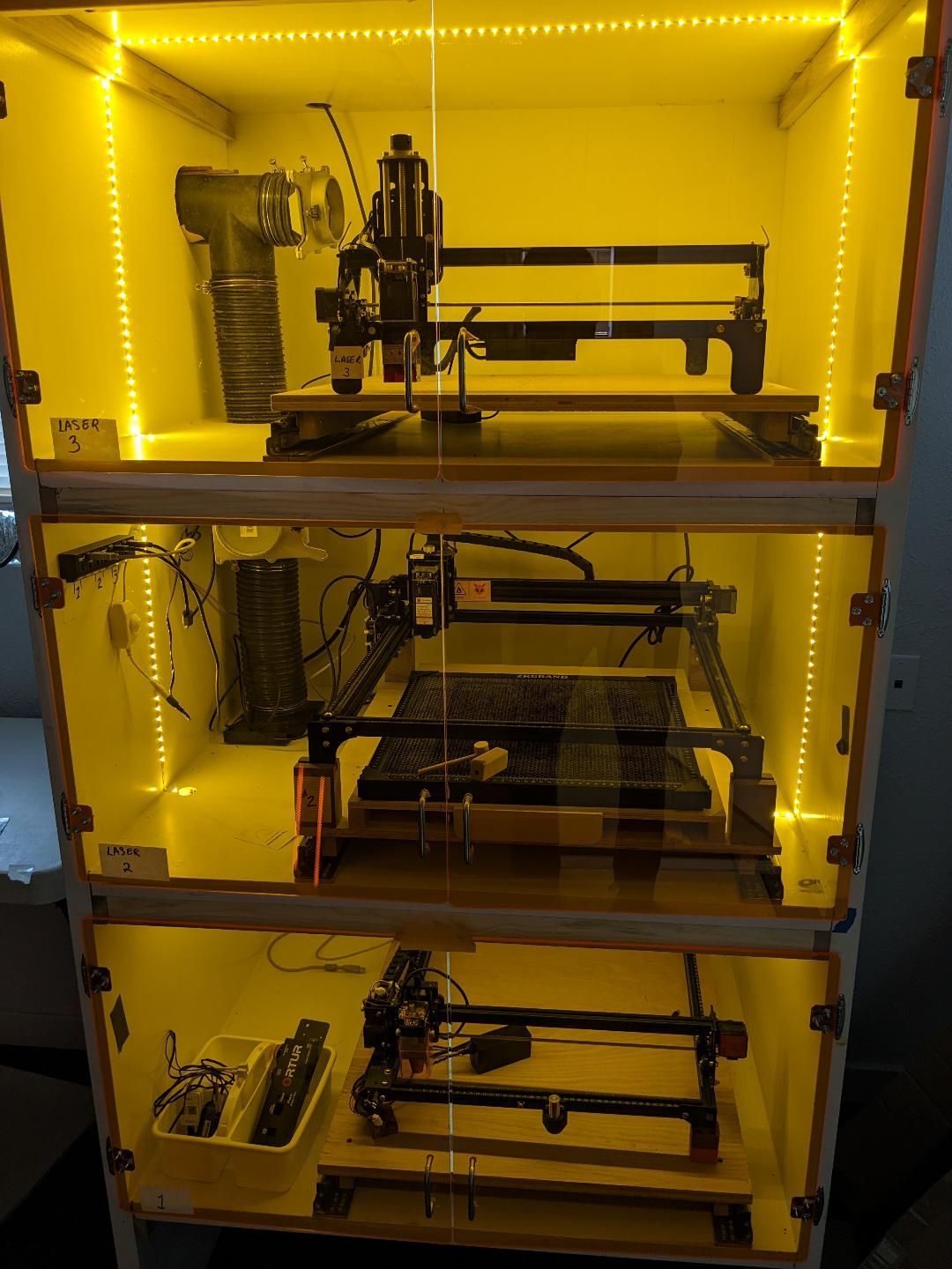 here is the laser cabt, done with exception of the exterior exhaust hookup, go figure i grabbed 5 inch flex pipe instead of 4'' at the home dip joint, silly me, oh well, but five min and its underway, have one awesome laser that fried the main board, am having issues with the chinese supplier on getting correct one, gonna give it one more chop chop and then go for a new one.