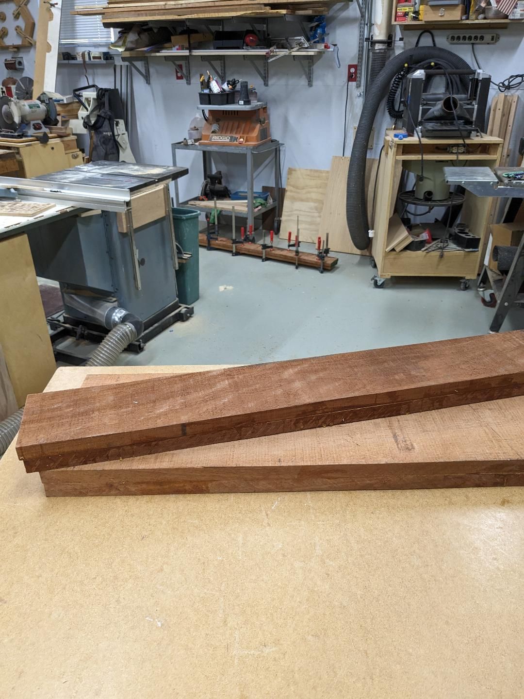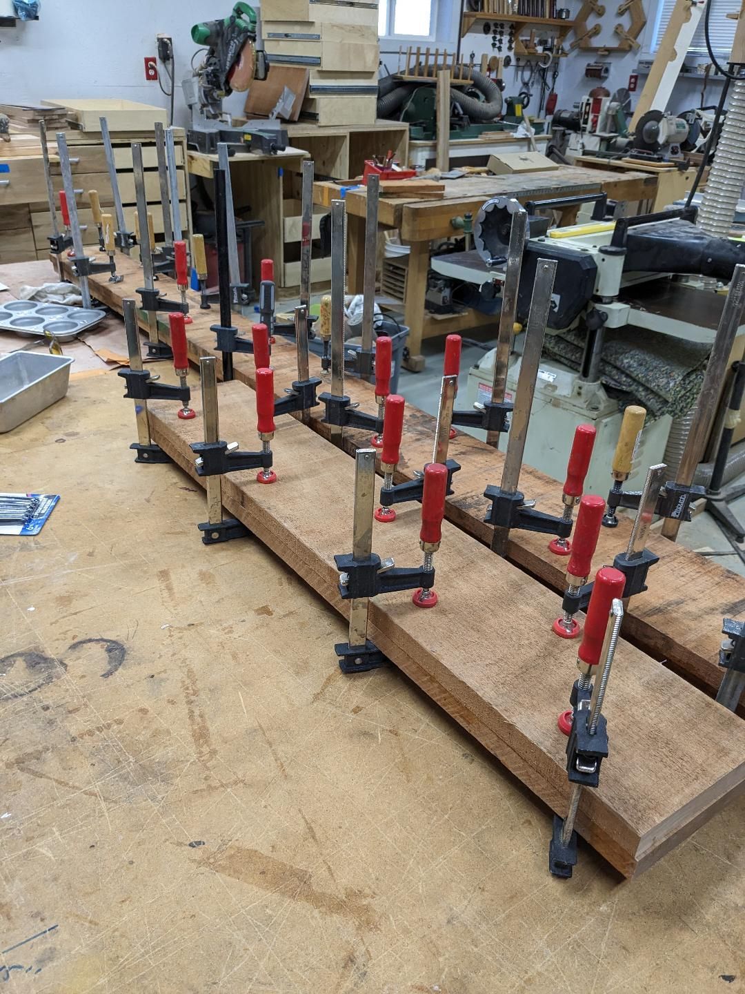 as always have a gaggle of projects underway, an associate and i are building him a craftsman style entry door out of african mahogany, glued up some vertical and horizontal stiles, a sample of why one needs so many clamp.s