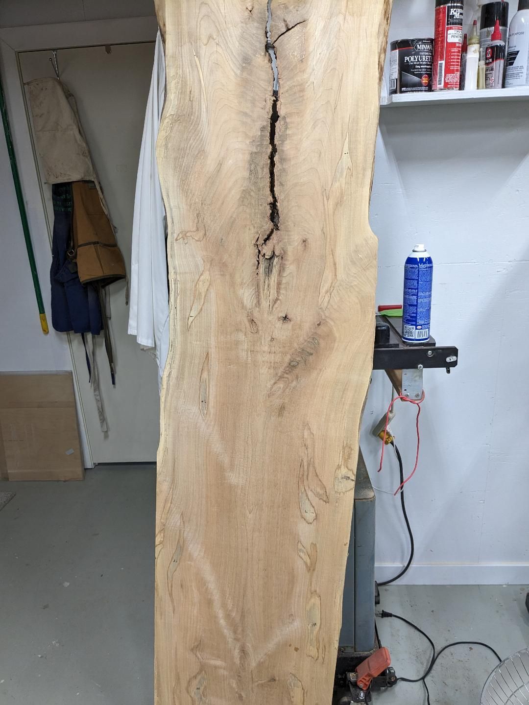 here are a couple pics of the maple slab i plan on making a console or hall table out of, so gonna have to put a couple bowties in, might do paduak, a contrasting really read, or sapale, am thinking the sapale with the ribbon type grain, will look awesome, other option is cherry, walnut, or mahogany, not sure mahogany would go well with maple due to texture.
