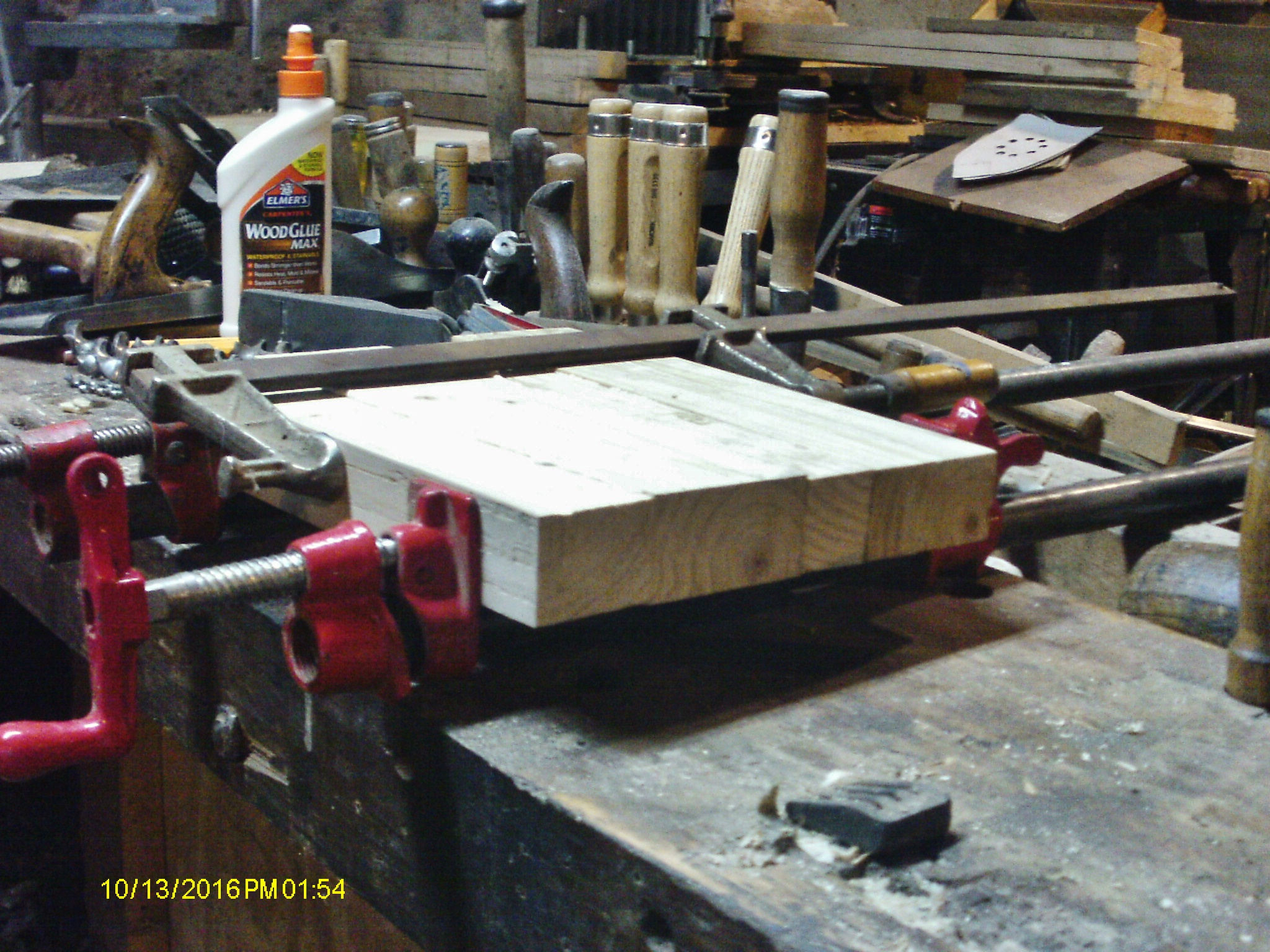 October 13, 20169 yr Author Well, I went and hid out in the shop today, until Shop Cat Campy "ratted" me out. Had a board that was ...out of flat....oppisite corners were a bit too thick.... The I sat down on the shop stool for awhile.... Used a few tools until two sides were done. Used those to mark where the fingers were on the end pieces.... Until I had all four sides done. Finger joints didn't look too hateful.. Resawed a few blanks for the bit holders...Didn't have a single chunk wide enough, soooooo Made enough blanks to make two glue ups. But, they needed a bit of work, before I could clamp a set up as a glue up.. Stanley No. 5-1/2 seemed to do the job. Got the first set into the clamps... I can come back tomorrow, and level this out. Then take a few auger bits, and the bit brace, drill down from one end. At least until The flutes can be covered. After drilling a bunch of sizes, I can then cut away where the top half of the holes are. But, only where I drilled out. "Below" that point, I need a smaller sized bit to drill just for the shafts/shanks of each bit. That way, the bits will stay put in the holders. Have to leave enough room to extract the bit as need from the holder. That way, I can tip up the end to remove the bit. Clear as mud? May just play hooky again, tomorrow. Stay tuned....
