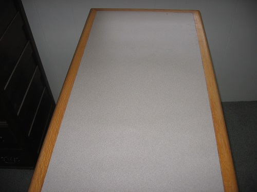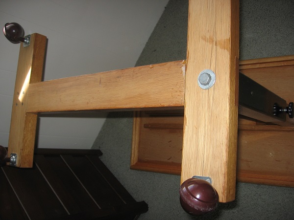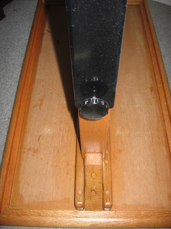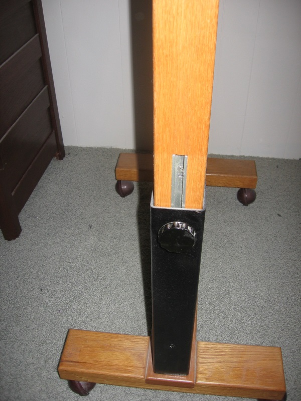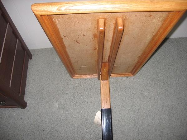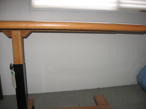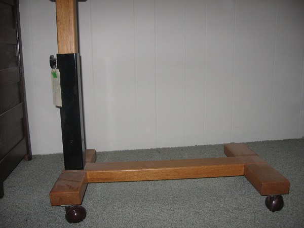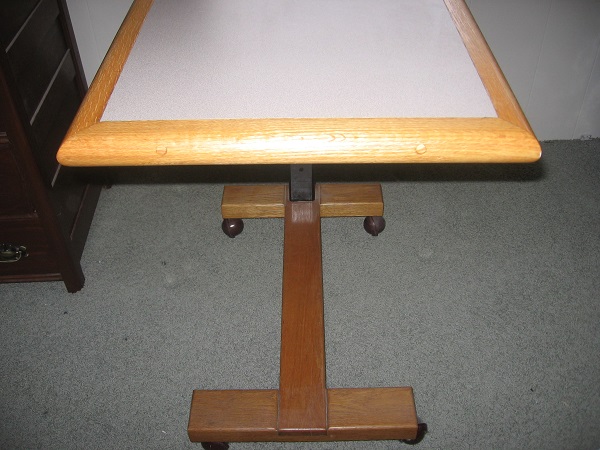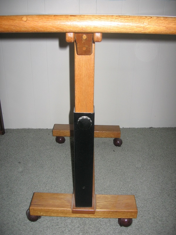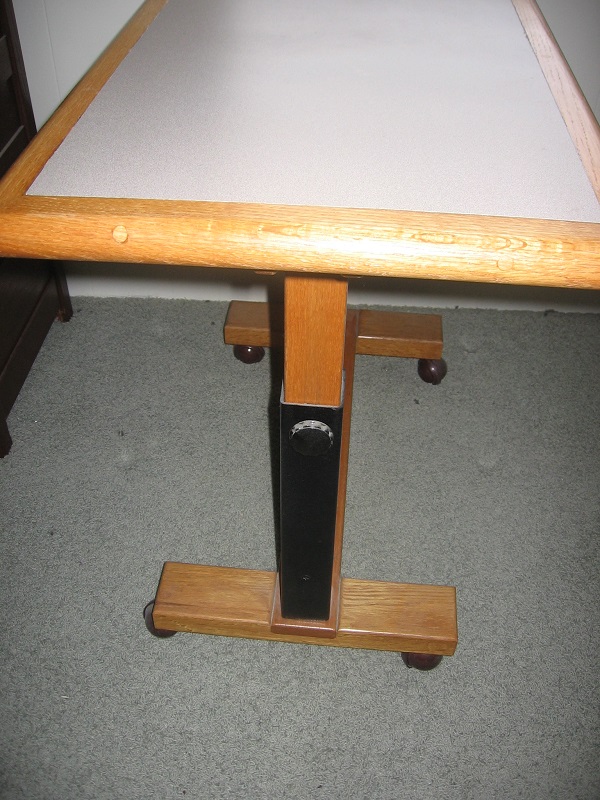 Several years ago a friend of my late  wifes was nearly bed bound and she asked if I could make a table like a hospital adjustable table so here is what I came up with. The post and bottom is made fron white oak along with the bracing under the top. The top is made from 3/4" plywood covered in plastic laminate. The steel tube is 2 1/2"X 2 1/2" , and the slide is a 3/4"X1/2" aluminum channel.