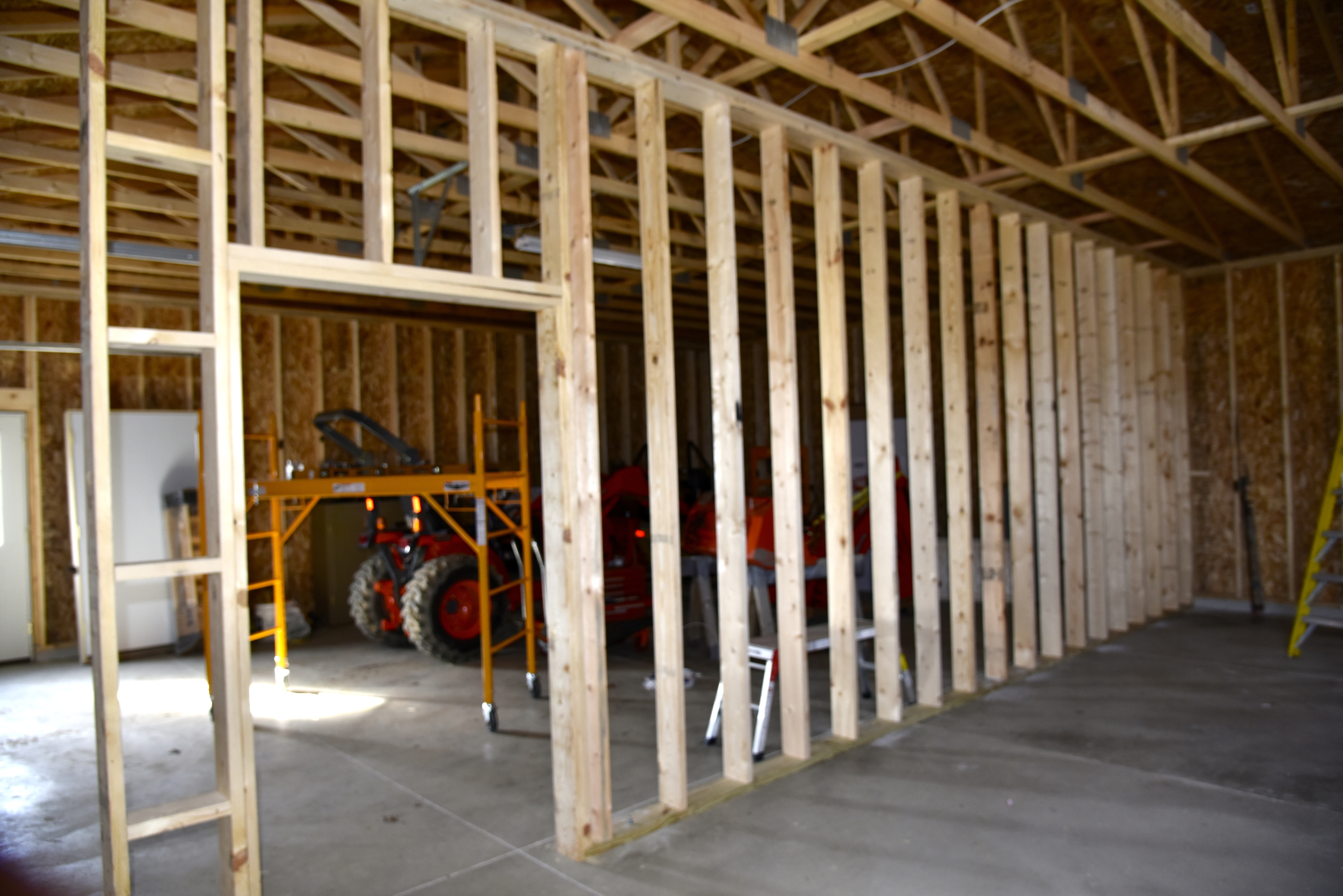 but I thought I'd show it anyway. I had asked about getting my partition wall up back in early November. Then life intervened (and Mother Nature with winter) and i didn't get much done after that question. But the days have been unusually warm so I was able to get some things done. the big one being I finished the partition wall. In one of the quirks of fate that seldom (never) happen to me, I had bought some number of 10' 2x6s and 3-10' treated 2x6 (sole plates) to build it. After I was done I had a 2' section of 2x6 lumber left, and a 4' piece of the treated wood. Typically I go back to the store (twice) for more wood. Anyway, here's some pics but remember: I am not a carpenter...nor have I ever claimed to be. There was just me, so I lifted the first third of it up using a deer hoist. But the next piece had to be done as one piece because of the door and the the way the top and sole plates were staggered. I wound up using my tractor with some pallet forks which was only slightly tricky, but still worked. That wall had to be up for me to continue on with the wiring.