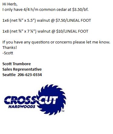 The cedar was 1.50/bf. That is the most I have paid for Cedar. Usually runs .85 to 1.00/ bf. The walnut was a stack he had that someone didn't pick up. It was about 300/bf