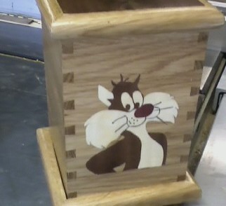 I thought I would share my take on the Sylvester and Tweety posts, My Brother always identified with Sylvester and said he wanted him on his urn, so that's what I gave him 2 1/2 years ago, All wood inlay with a scroll saw.  I almost seemed a shame to put it into the ground in Wisconsin but it gave his family much comfort in the months before his internment. R.I.P. Kieth.