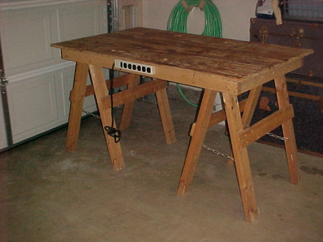 DAB Posted July 18, 2017 Report Posted July 18, 2017 14 minutes ago, Allen Worsham said: Here is a photo of my first mobile workbench that I made back in the later 1990's. At that time we were living in a condo with a 2 car garage. I needed a work bench that I could tear down and hang on the wall when not in use and that was the same height at the top of my table saw to be used as a run out table. It was very simple to make using 2x lumber and some plywood and then added in a power strip to plug in tools. I also cut out 4 hand holds into the table top and routed the edges to make it easier to lift and carry. I was able to toss it into the back of the pick-up when I did off-site work. This was a very heavy-duty table and I got a lot of use out of it and passed it along to my bro-in-law who still has it today. The quality of the photo is not up to today's standards, but you get the idea. many years ago i was at my sister's house for 9 days, so do some projects for her. she had no tools, i brought along a few and bought more with her money (they stayed with her), and of course, no work tables either. made 2 very similar to that. sheet of plywood ripped to 2 foot width, some 2x4s underneath, some sawhorses, and boom, i had 2 work tables, one for cutting, drilling, etc, and one for assembly. set up in an L shape in the driveway, worked great. all done for the day, break them down and store them in the garage. sheet of plywood is about $20, 8 foot 2x4 is about $3, some screws, saw horses (pre-made, or make your own), and you are in business. Quote