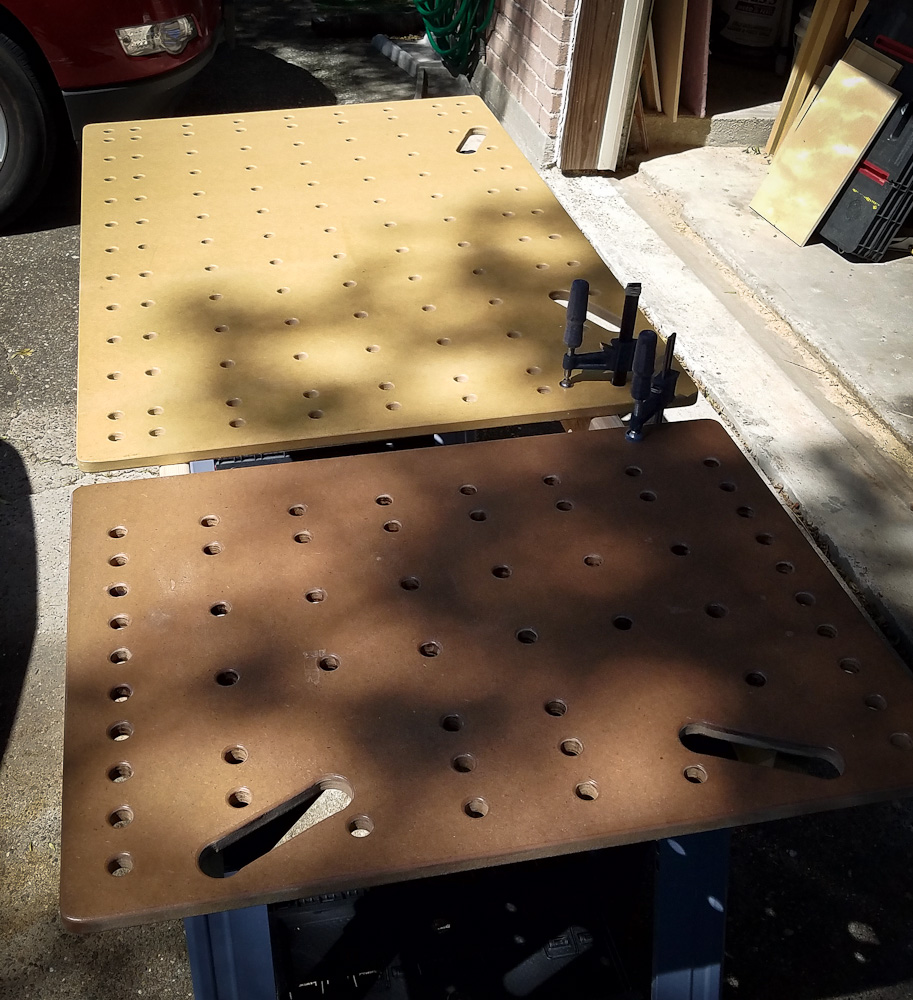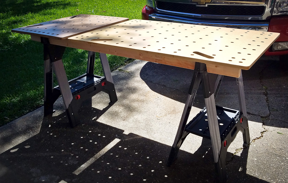 MT Stringer Posted July 19, 2017 Report Posted July 19, 2017 (edited) Pat, the work table doesn't have to be level, just flat. Right. I bought a solid core door at the Habitat ReStore once upon a time for $8.25 (discount Friday). I cut it down and made a work bench that got used and abused for four years. Many projects were built on that thing. But, it was heavy! I have a portable work station (and one of those Keter portable tables). My work table is a pair of saw horses that have adjustable height legs. I also have some 3/4 mdf that a fellow carved 3/4 inch dog holes in for me. I have since made my own to give me some additional work space. Here are a couple of pics. It works well, and I plan to use it tomorrow to break down 4 sheets of prefinished birch for some cabinets I am building. Edited July 19, 2017 by MT Stringer Grandpadave52 and HARO50 2 Quote