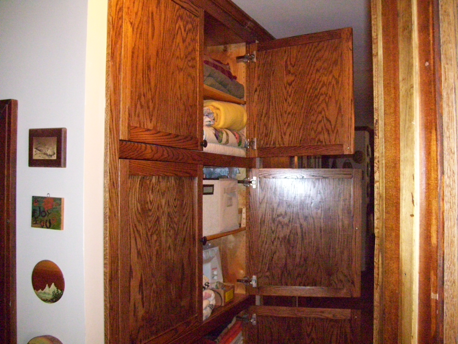 Well don't know what happens to my post earlier this morning seems to have disappeared.  No telling what I did wrong.  Finally finished this project after 3 out of town trips and some other activities that kept me away.  It a lot work to make this in 3 sections for my small shop.   The side and back panel is Birch Plywood from the home center.  I was not too impress with it but that what my wanted.  The face frame and doors frame is Red Oak lumber with 1/4 inch Red Oak Plywood panel.  The shelves is what the home centers called Select Pine or Clear and Better Pine.  It the closes that I could come up with to match the plywood.   And yes my wife beat me to it in filling the shelves up beforwe I got the picture taken.