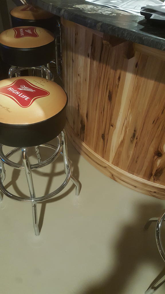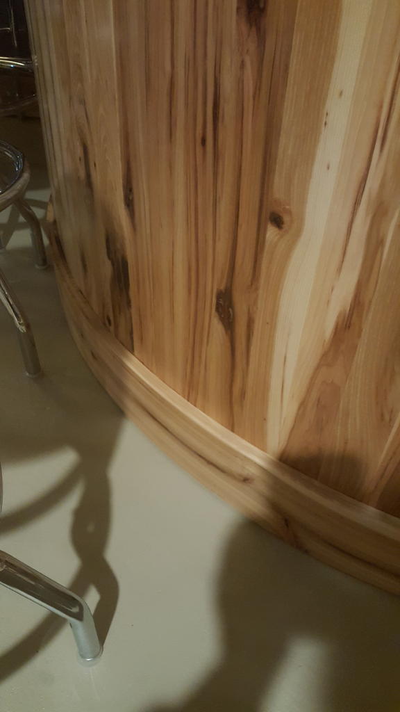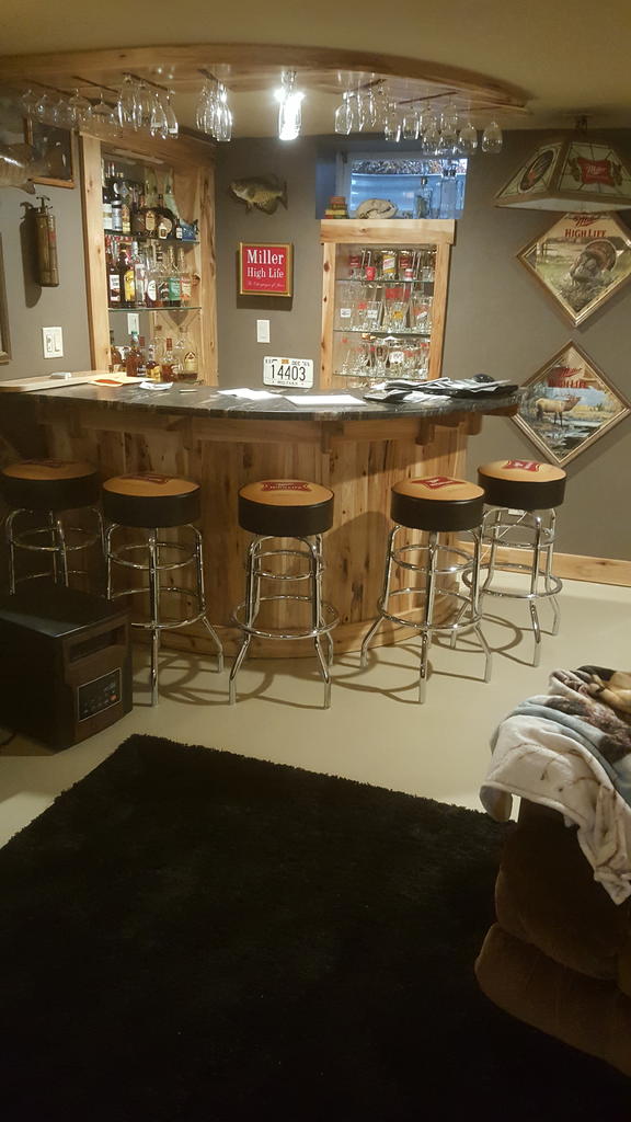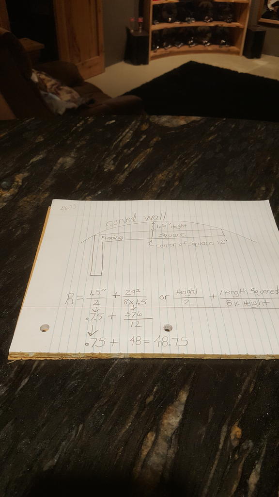 I found the formula I was looking for, I like learning things, instead of punching numbers into a computer, but I have limitations when it comes to my thoughts. Using the site Danl posted, both methods come out with the same radius, and 48.75" does ring a bell. I will bend 3-1/4" boards to get the 3/4" thickness, as shown on the base of my bar. For you information using 1 9/16" height or 1.5625 instead of 1.5" it changes the radius by almost 2". Also, kerfing would not work, as I don't want to see the kerf marks, thanks for everyone's help. I also don't know why the 8 in 8xheight comes into play, but it is a number that does not change in Danl's post.