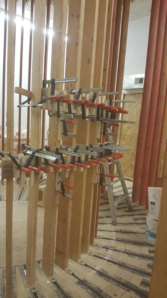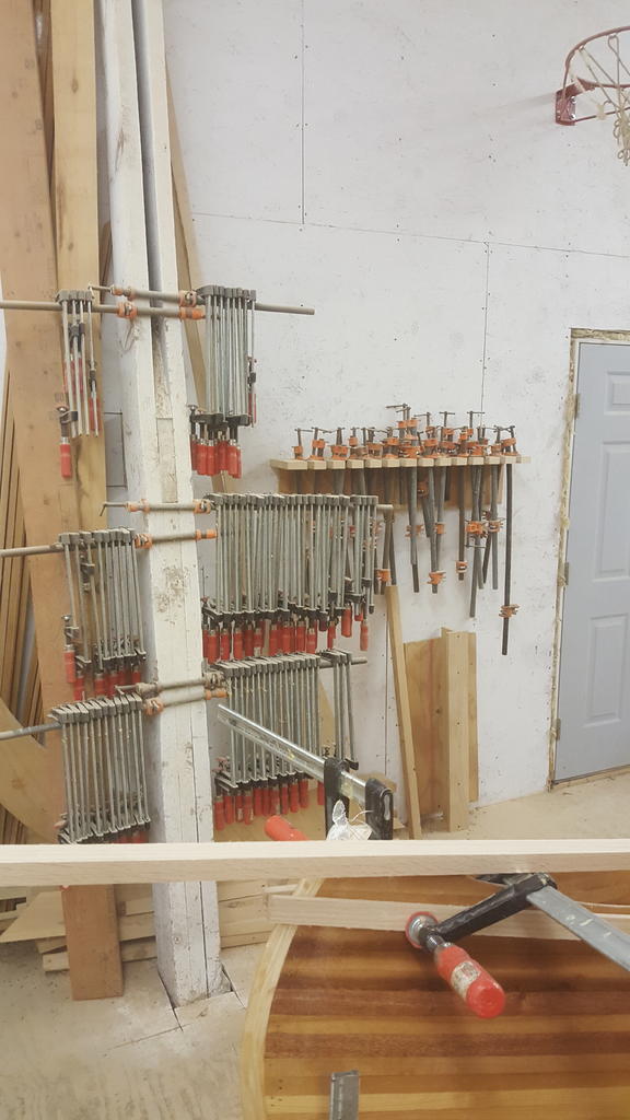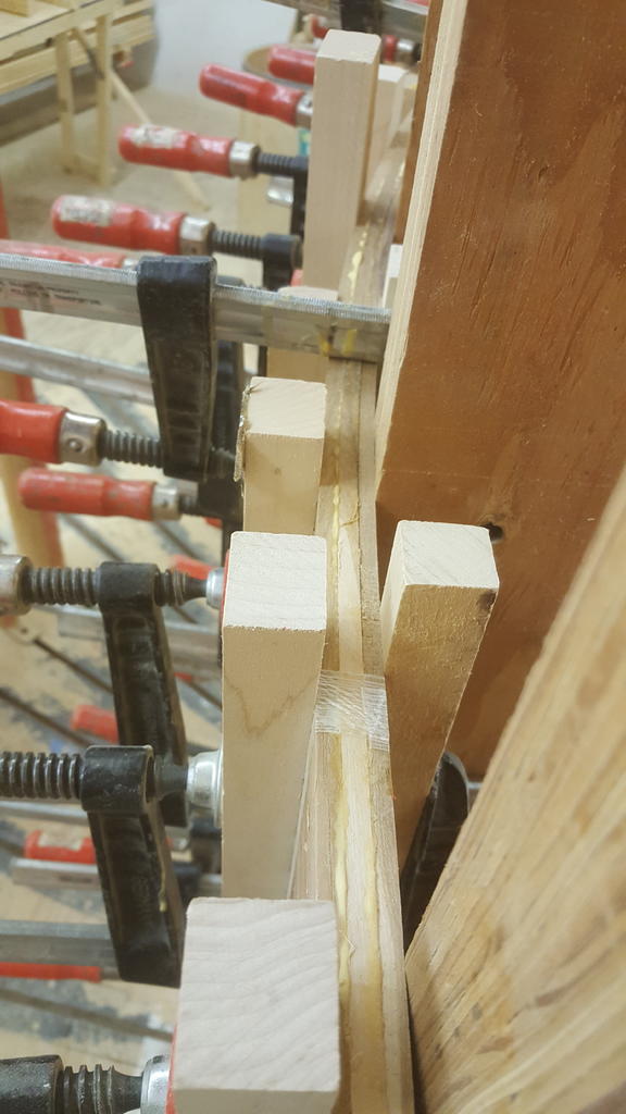 Bent the base today, three 6" boards resawed on the table saw, gives me 6 boards at 48" plus or minus( enough for the project) milled them down to 1/4" each and spread the glue, and clamped them up. Plenty of clamps on hand, I'll never run out of them clamps. I over bent them at a 47" radius, when they "relax" they'll fit just fine