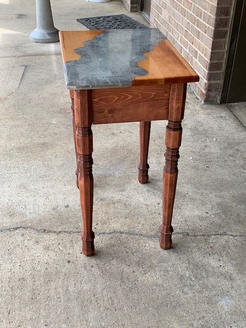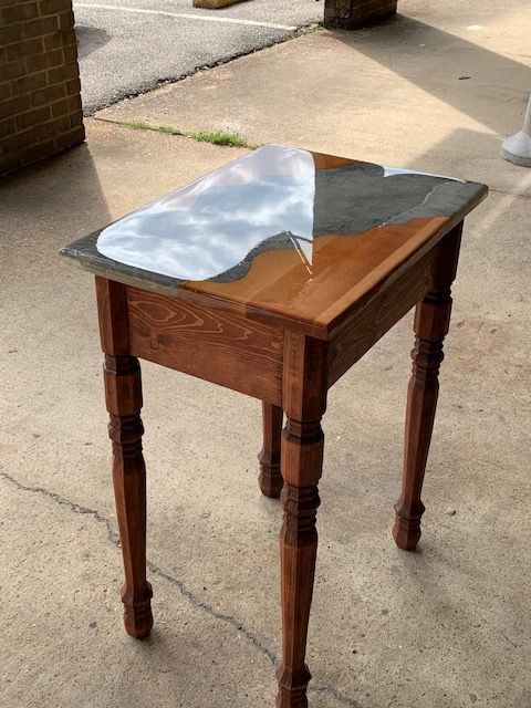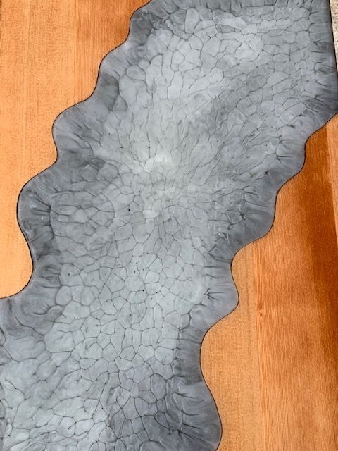 Table top... I took a square piece of oak(?) that someone had scrapped, drew a wavy line. Cut it on the band saw. I build the frame for the epoxy. I mixed one batch of epoxy and added black metallic mica powder. Poured and began mixing a second batch. This one was tinted white with acrylic paint and added silver mica powder. Poured and used the stir stick to swirl the two pours together. The way it came out (the almost crackled appearance) was purely a chemical reaction that I did NOT expect to happen. When I left it, it was swirled, almost looked like a marbled surface. When I came back the next day, it looked like that.