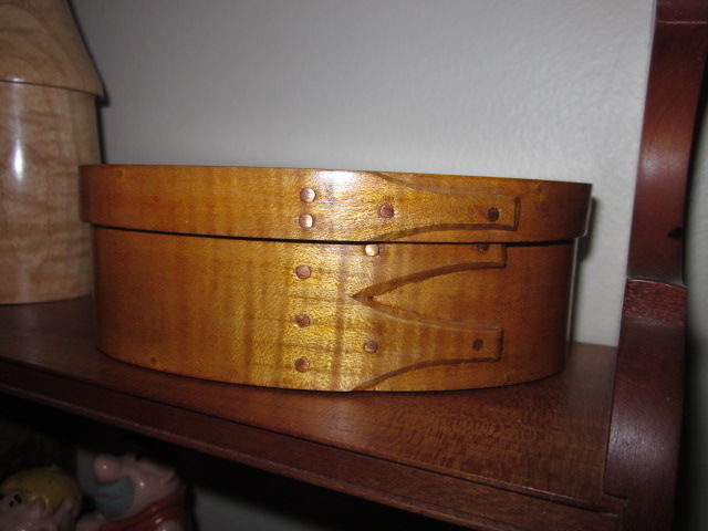 • Well, here is the finished product.  5 shaker oval boxes made from, mostly, Curley maple.  Finish is danish oil and 4 coats for a satin poly.  I placed them for sale on Facebooks Marketplace.