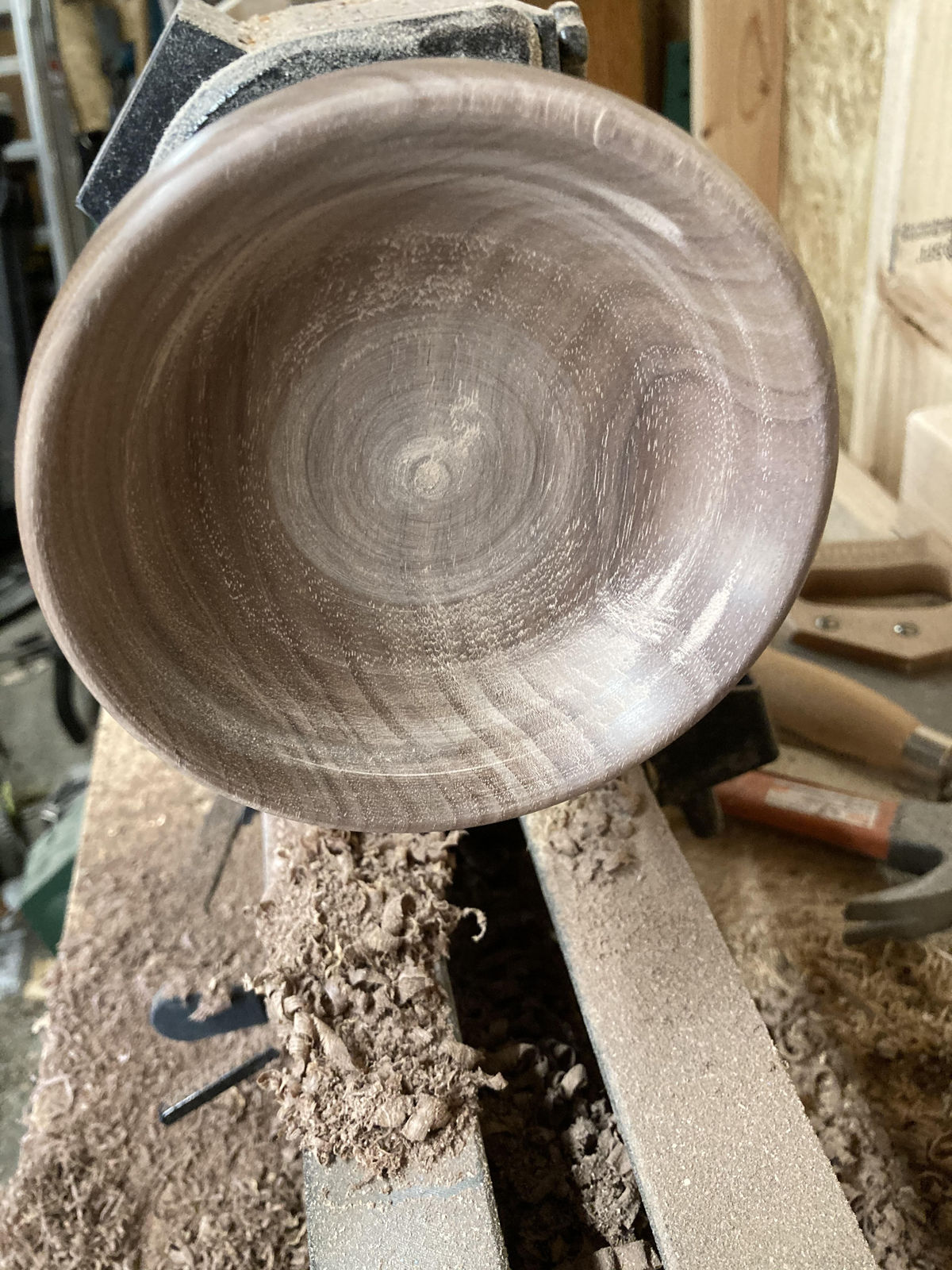 That looks pretty nice. I think I'd try and refine the outside shape a little before finishing the hollowing. Just smooth it up a little- light touch keeping the tool rest fairly close to the work piece. Then go back and finish the hollowing.