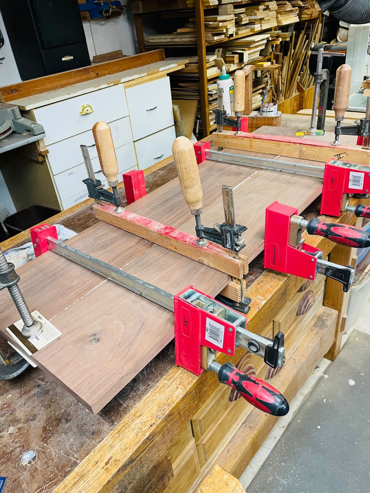Popular Post Gerald Posted January 23, 2021 Author Popular Post Report Posted January 23, 2021 Sanding time but that is no fun. Needed sanding discs so used a giftcard and got some Diablo as they do not stock my preferred Norton 3X anymore, Bummer. Do not really like the Diablo and the universal pattern does not work on PC 5 hole sander. So had to punch some holes. Then time for chamfers. Love the LV low angle. Then some glue and clamps and both end ready for shelves and drawer box. DuckSoup, HARO50, p_toad and 5 others 8 Quote