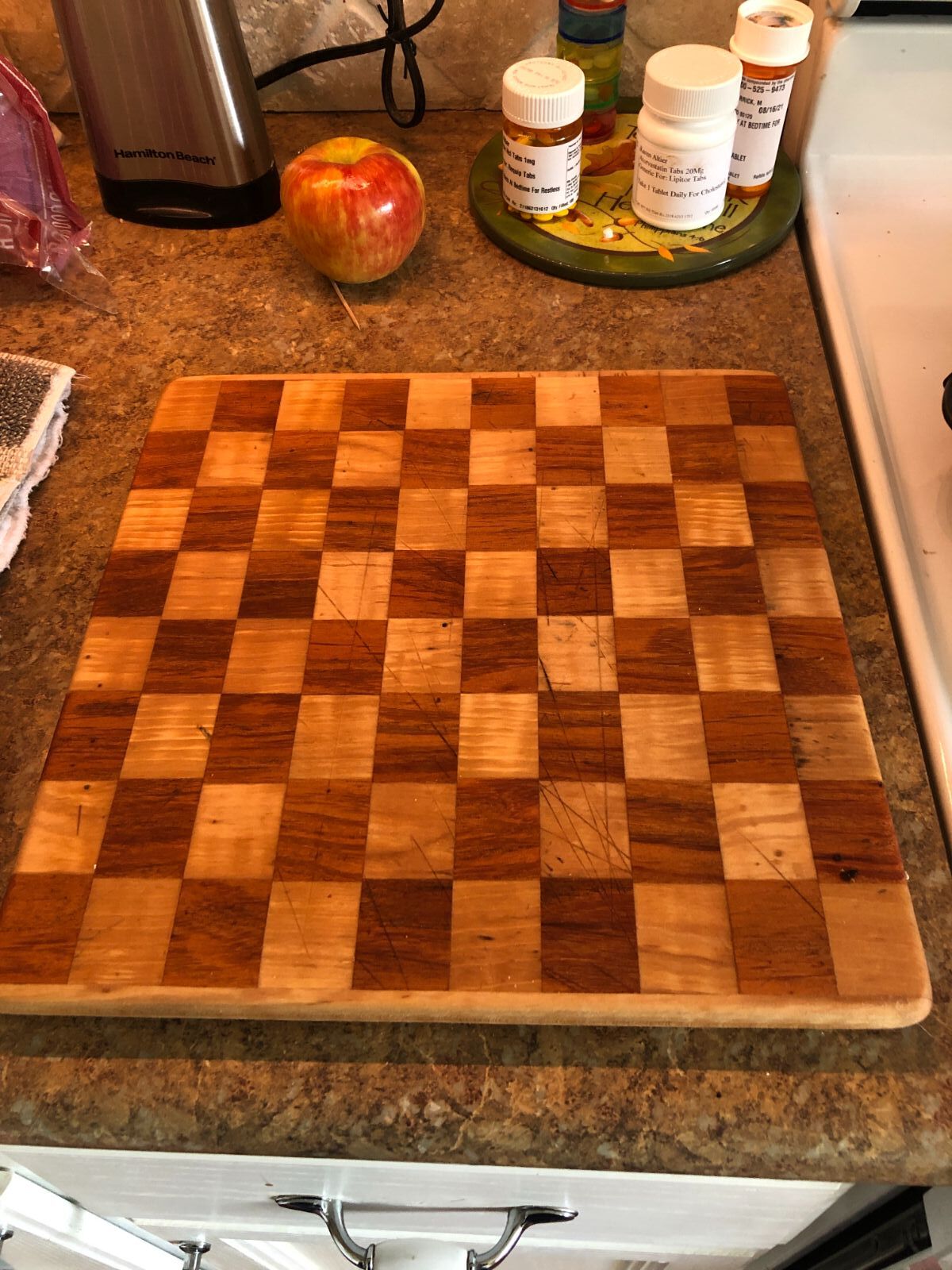 Here is one of the reasons I asked about extra support for cutting boards. I made the cutting board pictured possibly 20 years ago. It was made of 2 hardwoods and was stripes only. (No squares.) It became beat up from all those years usage. My wife wanted to toss it. I thought I'd try to make squares out of it. When I cut it up, it was full of biscuits. No wonder it had held up so well. I cut it up into strips across the grain and selected the best of the best and made this one. Its about a foot square. It shows wear, even tho I sanded it really well. I was VERY sure my wife would NOT like it. It seems that even after 50 years of marriage, I still don't know here tastes. She loved it.