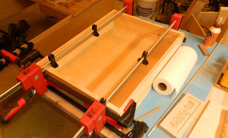 Got the drawer slides and drawer mounted.  First look tells me the base frame is racked a bit as the drawer doesn't close evenly. A belt clamp across diagonally opposite legs corrects that, but wasn't supposed to be part of the design.  Working with compound angles and less-than-perfect materials shows its ugly side.  Hoping once I mount the top the frame may stay square, but know that mounting to allow for expansion/contraction of the top leaves some movement freedom of the base.   Base may need a turnbuckle diagonal tension member. :(