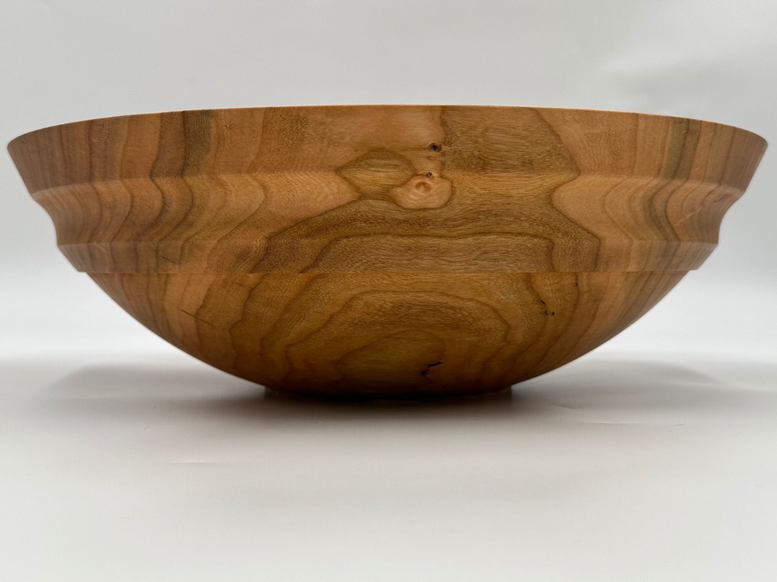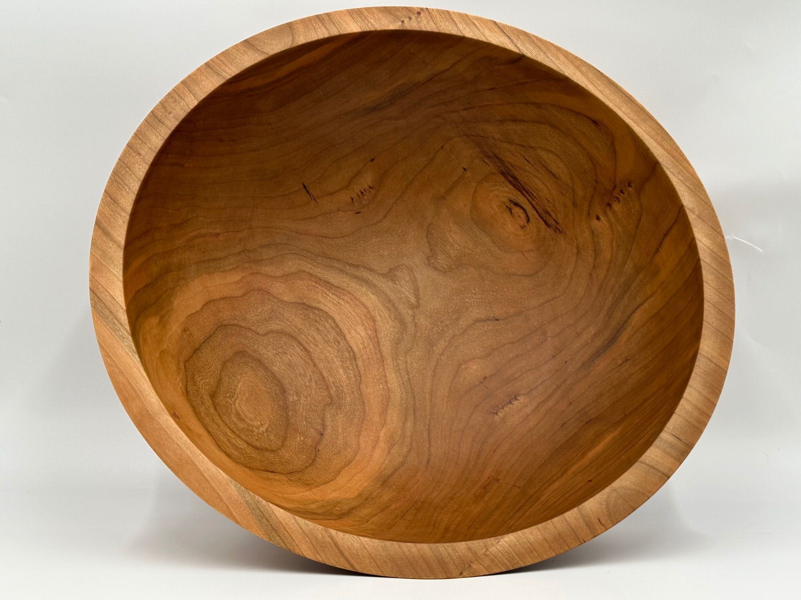 This is a 16” native cherry bowl. Should have taken more, better pictures. It is cery thin- for me. A little more than 1/8” exept for the thickened areas of the rim, which the hand falls to nicely.