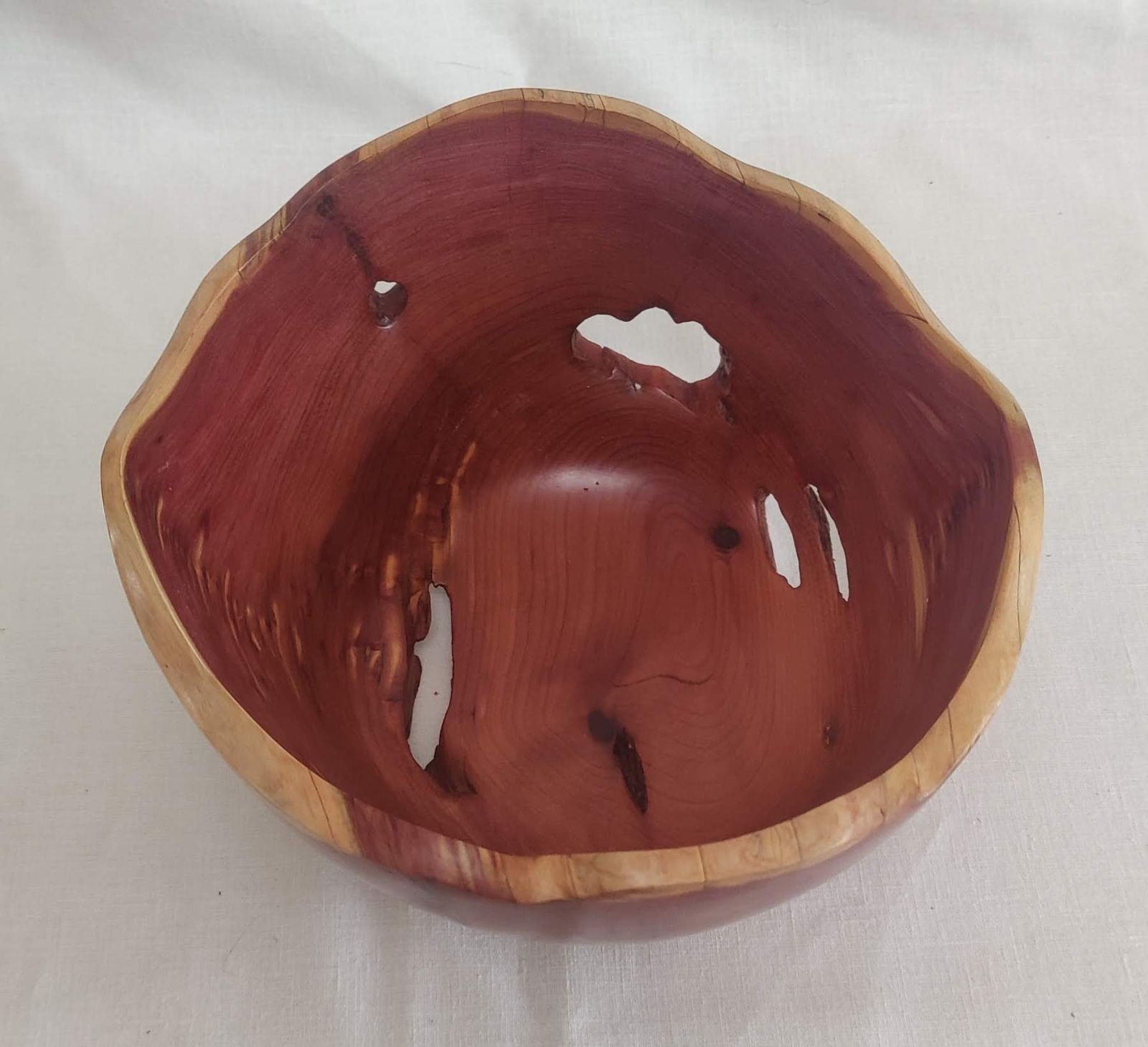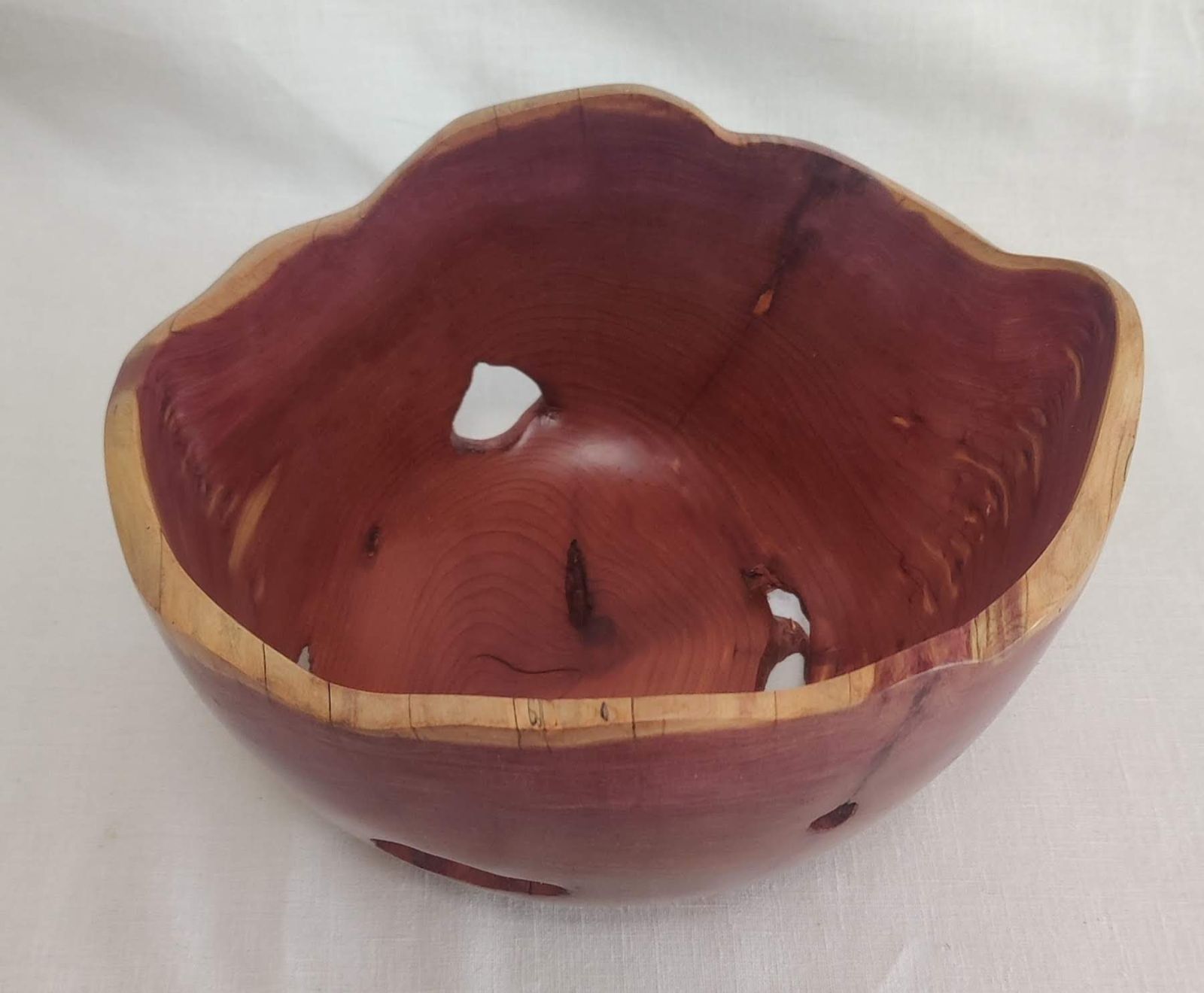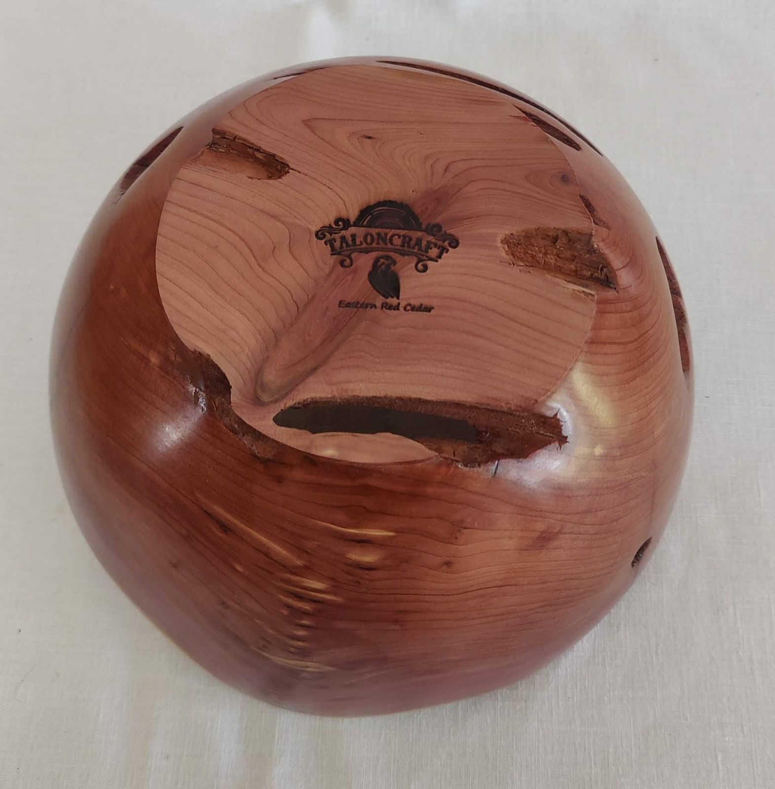Eastern red cedar bowl I took from a very old, dead cedar on my place. Three coats of shellac (1# cut) and then Yorkshire grit. 9" x 7" deep. The bottom needs finish still.