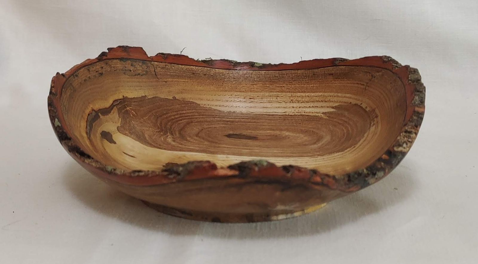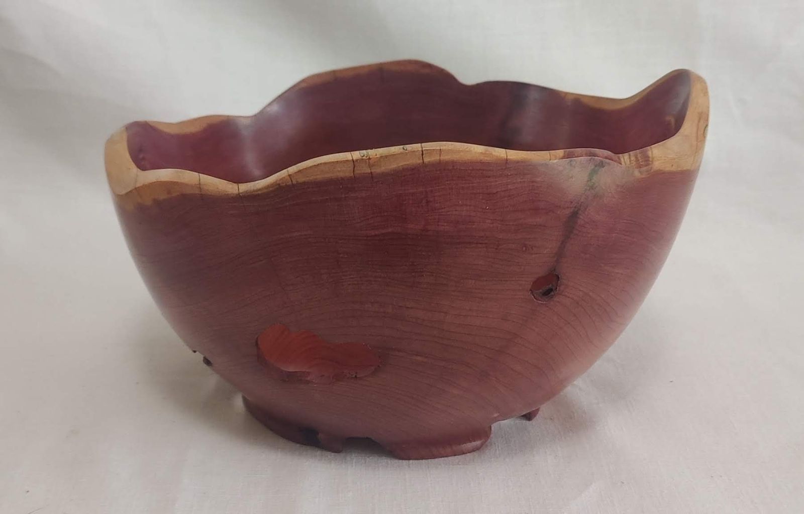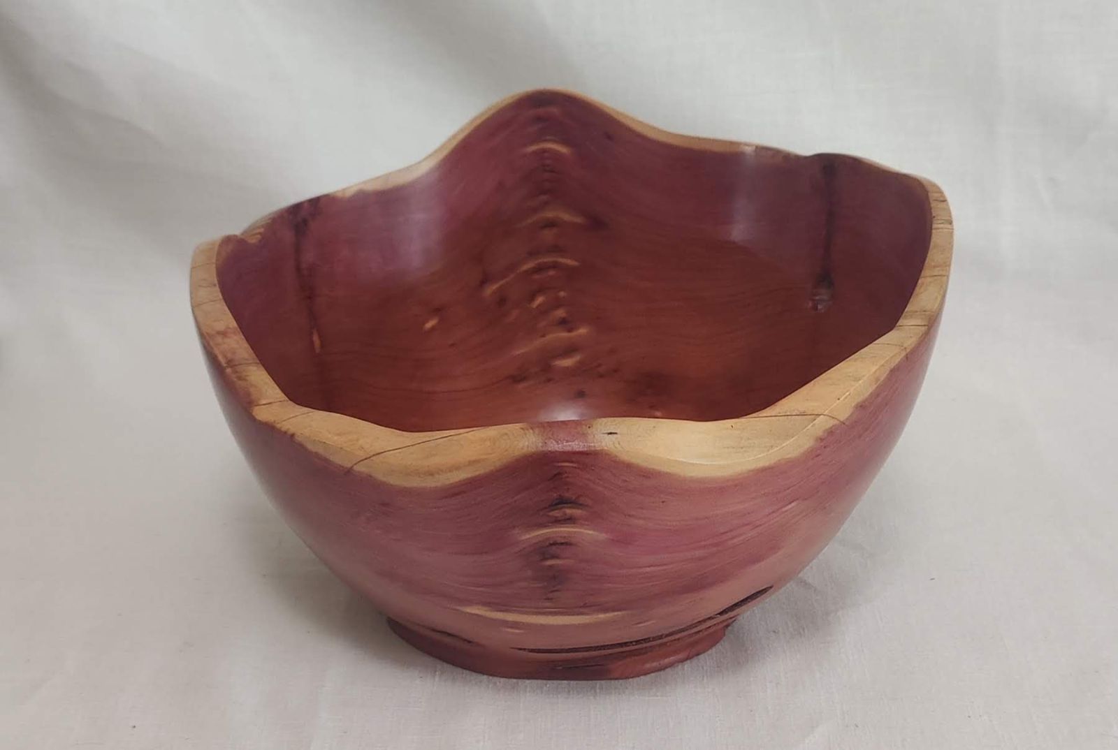 Eastern red cedar bowl I took from a very old, dead cedar on my place. Three coats of shellac (1# cut) and then Yorkshire grit. 9" x 7" deep. The bottom needs finish still.