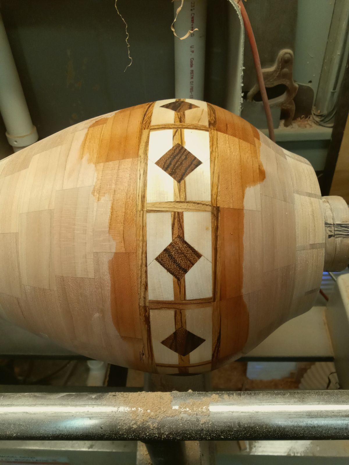 Well taking a lot longer than it should but getting there. The picture here is all in one piece now and still with the between centers waste blocks. The finish is just a little water to raise some grain before sanding. Cherry , yellow birch and zebra wood. just want to get this off the lathe and to the gallery. If I ever finish it I will throw in a all done look.
