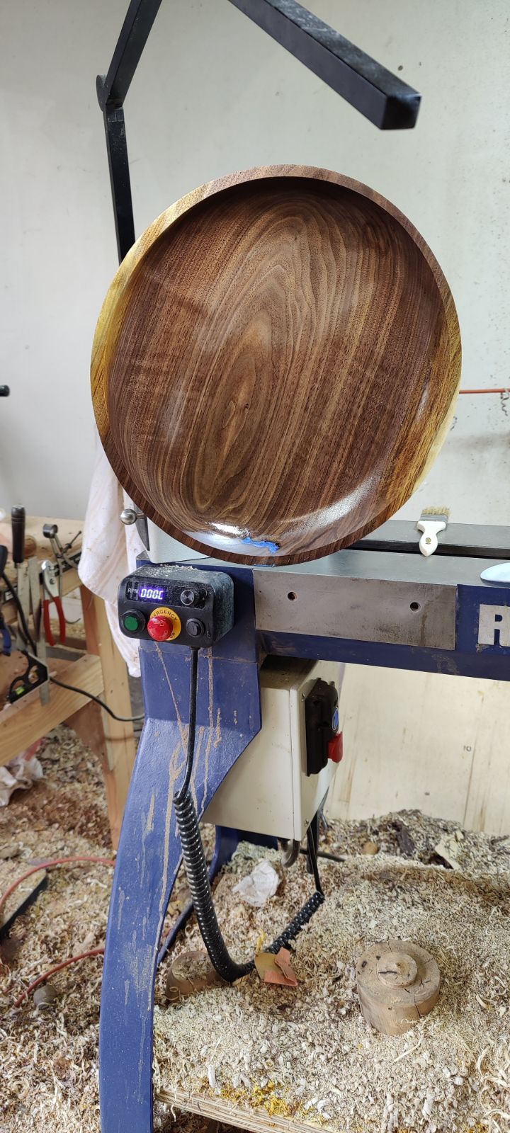 Work in progress. 14" walnut shallow bowl/platter. I had just applied shellac as a sanding sealer in this shot. There's a void that I filled with epoxy, but needs more work. I'm a rookie at filling voids.