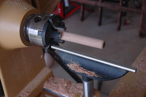 Go ahead, laugh at me, it's been done before. But I had a few minutes of time between doctor visits and starting dinner so this is what i did. I use a lot of 3 and 5 gallon buckets around the property for all sorts of things. But the plastic handles are not only uncomfortable when the buckets are filled with something heavy, they also fracture and break off easily. So I made some wooden ones on the lathe to replace them. Being an untalented turning guy, this gives me a chance to practice using some tools I find difficult (like a skew) and still produce something that's practical (for me) as well. So all I do is turn the handle (always white oak) and then drill a 5/16" hole through it. I then saw in 1/2 lengthwise on the scroll saw (thinnest kerf I have) and glue it back together on the bucket. So that's what's on my lathe at the moment......